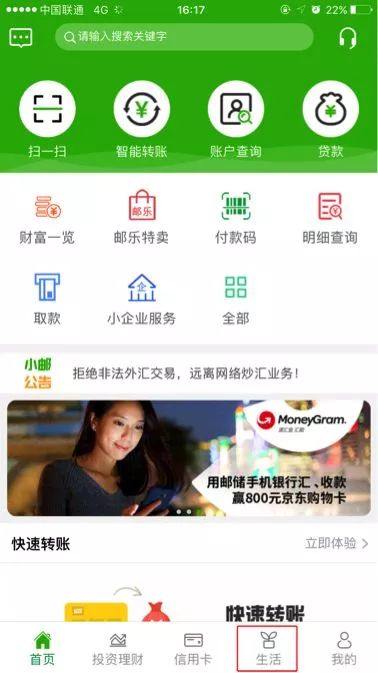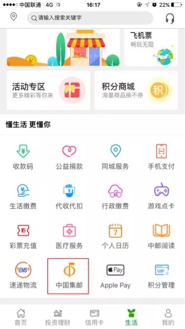 在邮储银行APP首页下方点击“生活”,进入“生活”页面之后在下方选择“中国集邮”模块。