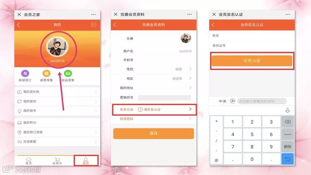 点击【我的】-【会员头像】进入【完善会员资料】页面,可进行用户实名认证。输入身份证号、姓名,点击保存即可。