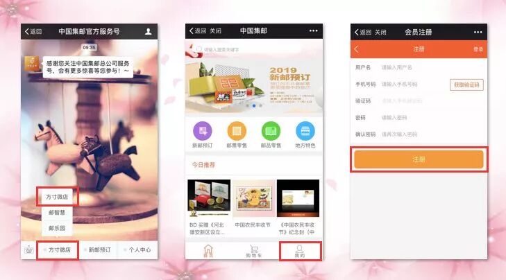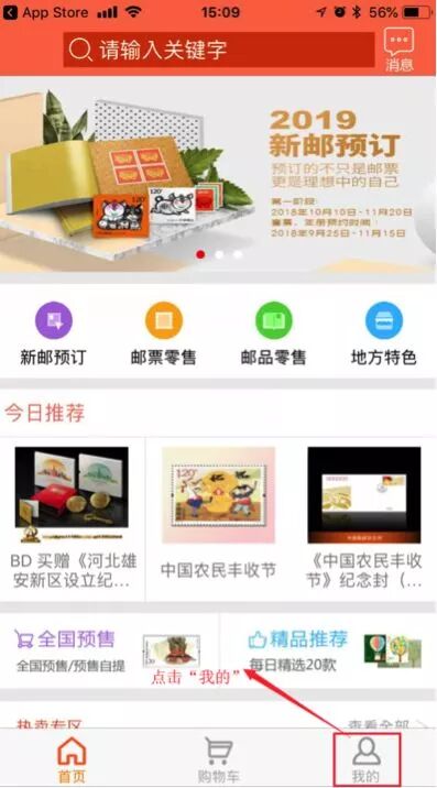 通过安卓市场或者apple store下载安装“中国集邮APP”,进入集邮商城。点击“我的”进入登录注册页面。输入对应信息注册后进行登录。