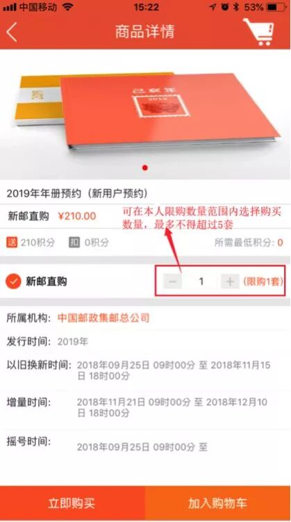 网厅导航栏“新邮预订”菜单和“2019年新邮预订”橱窗均可以选择商品。但需要注意,只有“年册预约”、“套票预约”是针对新用户的,点击需要预订的品种,进入商品详情页面,可根据预订资格选择购买数量,将商品放进购物车或者立即购买。