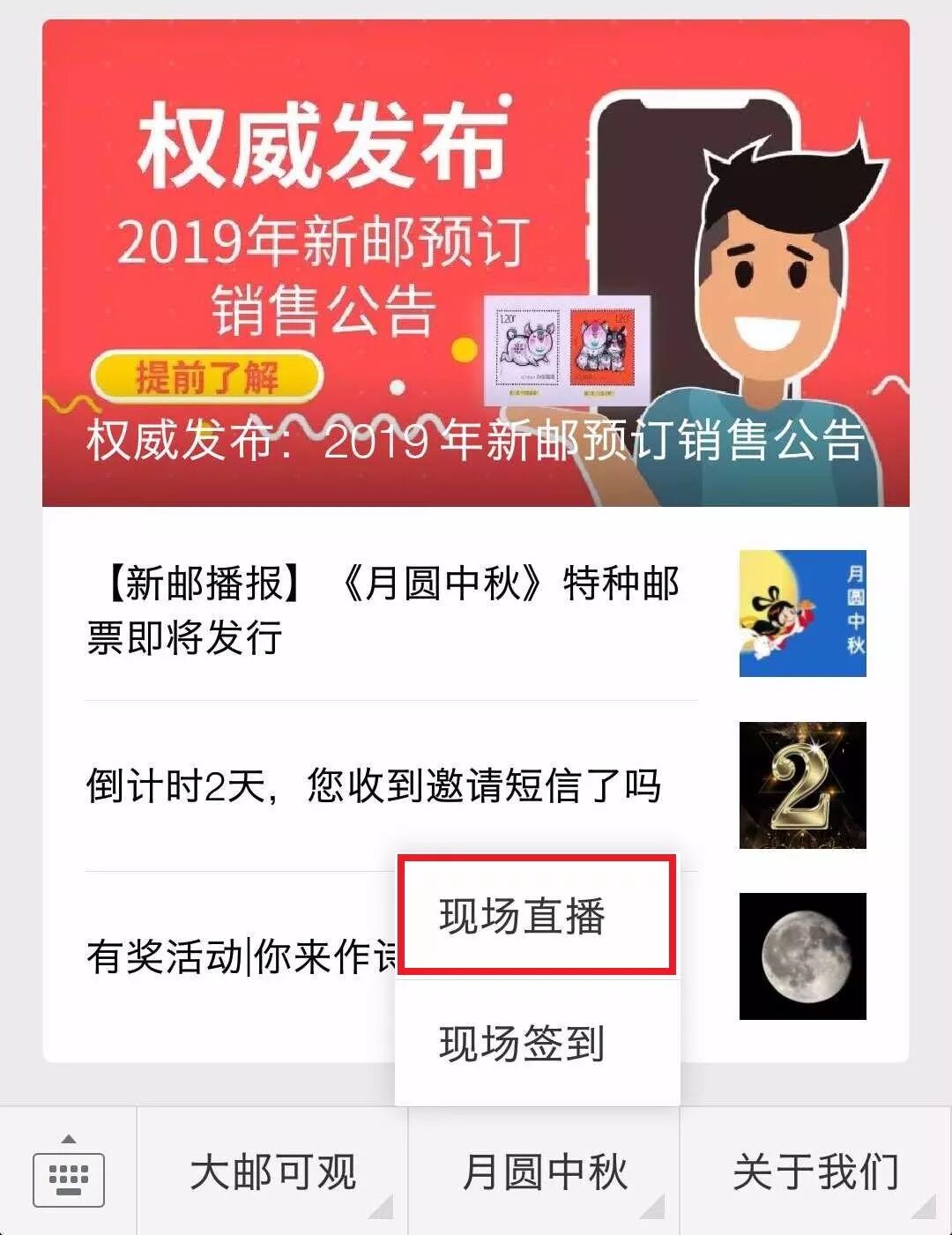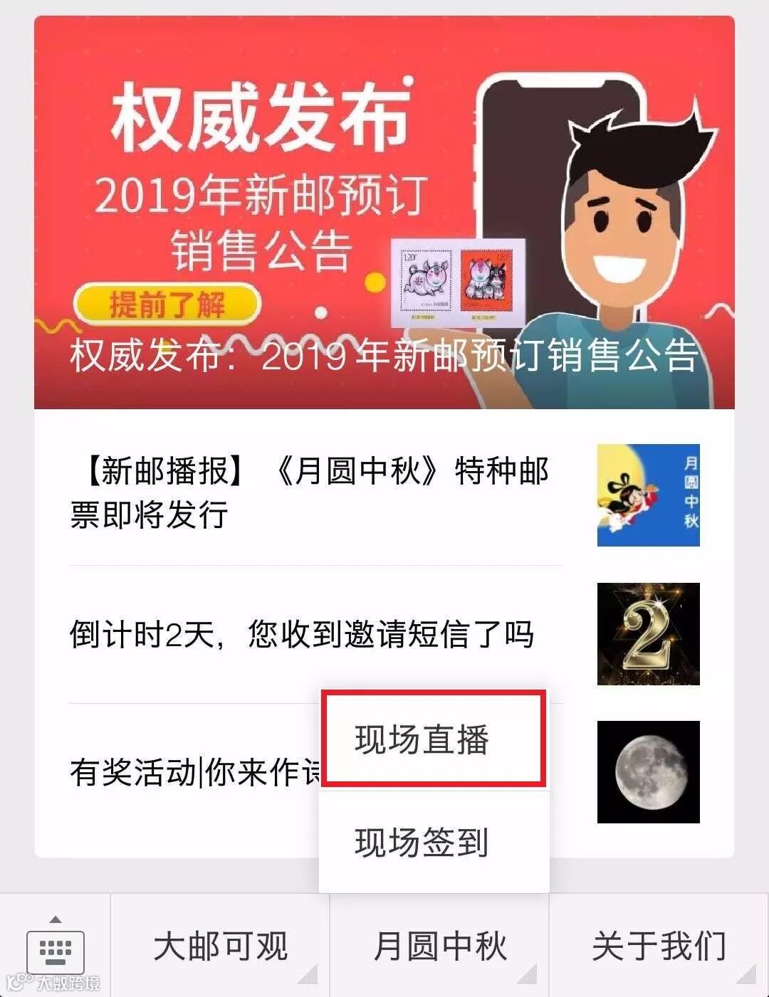 2、关注中国集邮微信,点击“现场直播”自定义菜单,观看直播。