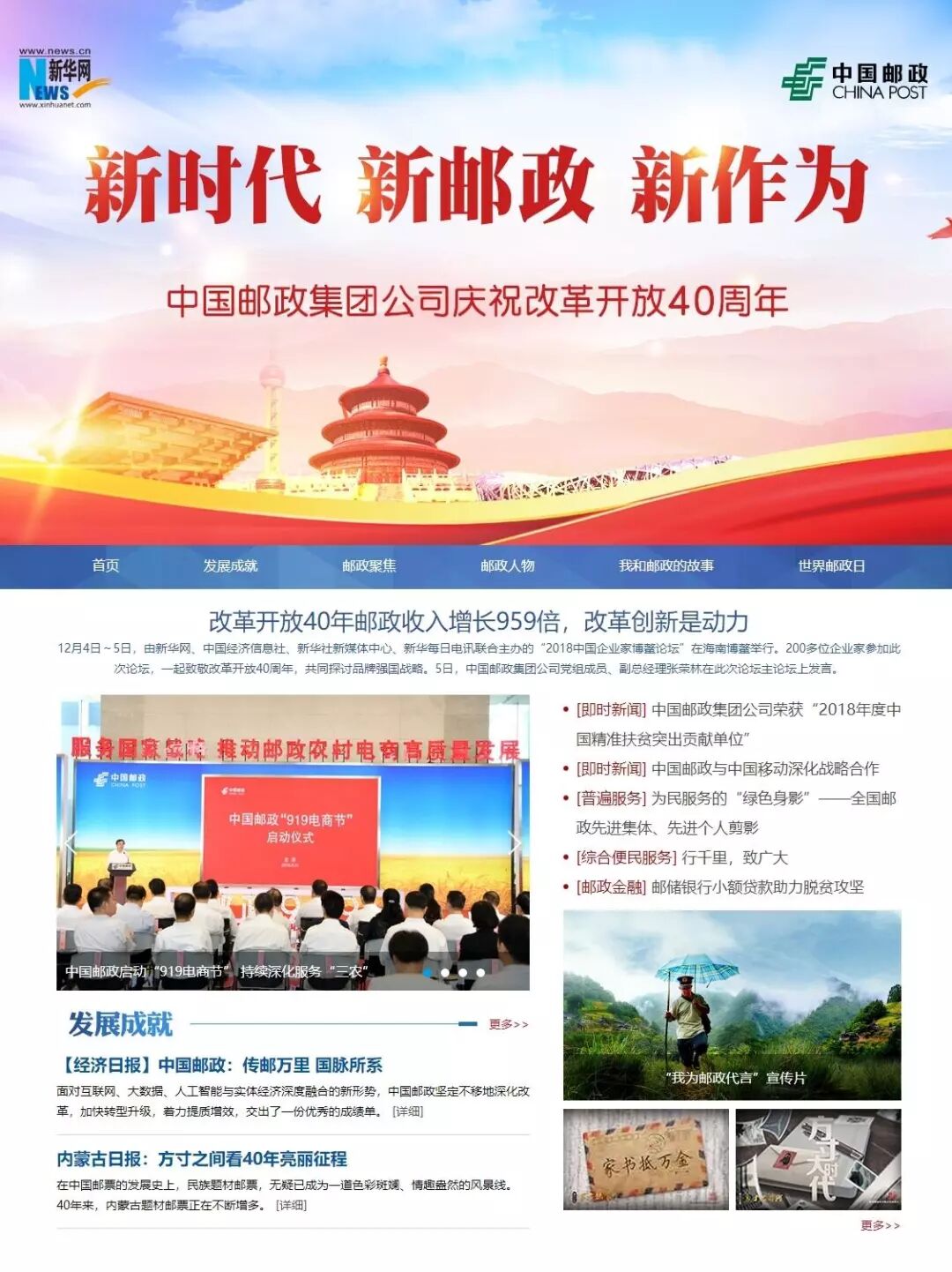 新华网开设“中国邮政集团公司庆祝改革开放40周年”专题,全面展示中国邮政庆祝改革开放40周年系列活动和40年来中国邮政取得的发展成就。