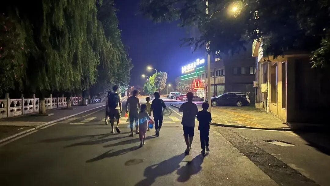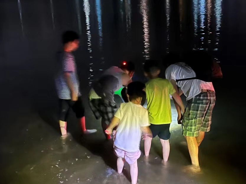 这充实的一天大家都不觉得累,晚上七点才想起来赶紧该吃饭了。晚上,大小朋友又跟着军老师去夜观、踩水,太欢乐了!