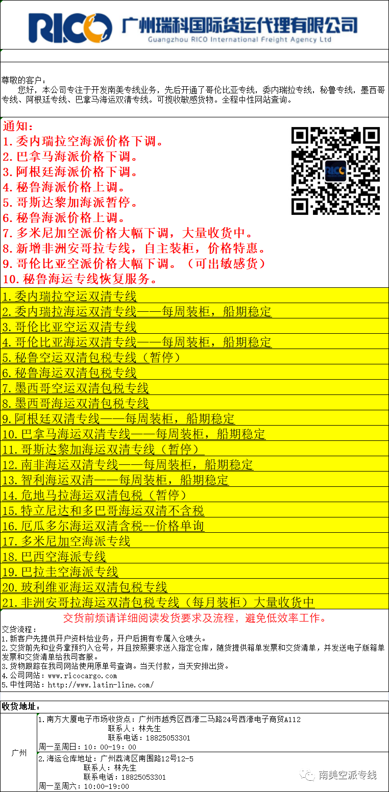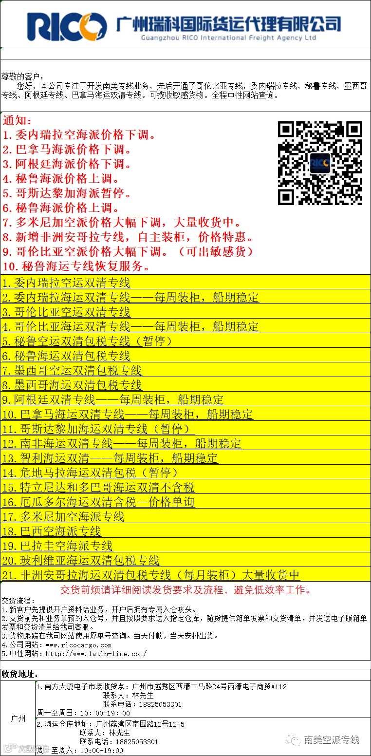 广州瑞科将全力打造拉丁美洲的全航线一条龙服务,为降低拉丁美洲的运费而不懈努力,希望能得到各位同行客户朋友的支持,如有兴趣,可以联系我司林生,洽谈合作,共同发展。谢谢大家。