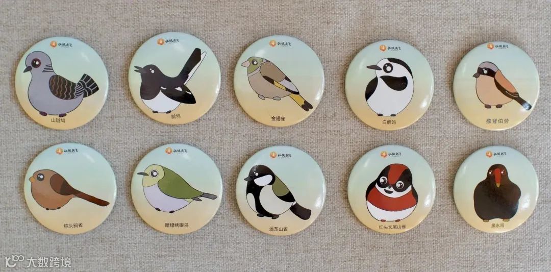 鸟种徽章,见过真实版的小鸟的小伙伴们一定也很好奇漫画版的鸟儿是怎么样的吧,这款系列徽章包含了许多上海常见的鸟种,金翅雀、远东山雀、山斑鸠的动漫Q版形象都能在这里找到,把它扣在衣服上,背包上,其他观鸟小伙伴看到了都忍不住想多看几眼~