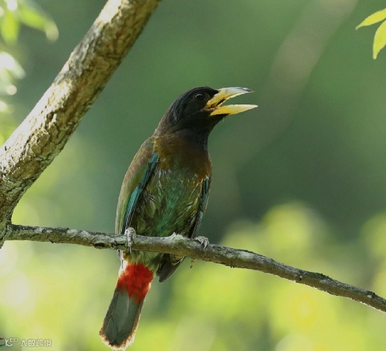 大拟啄木鸟—常栖于高树顶部,能站在树枝上像鹦鹉一样左右移动。叫声单调而宏亮,为不断重复地‘go-o, go-o’鸣叫。