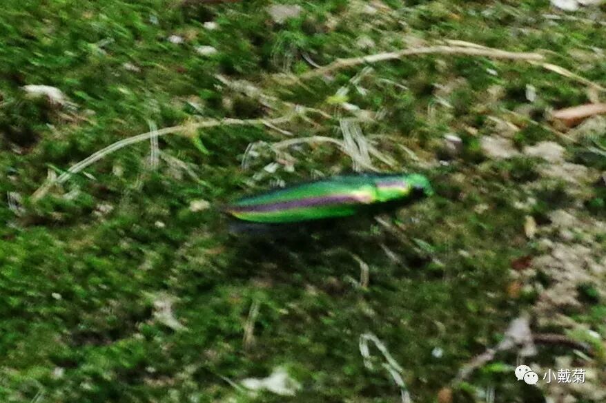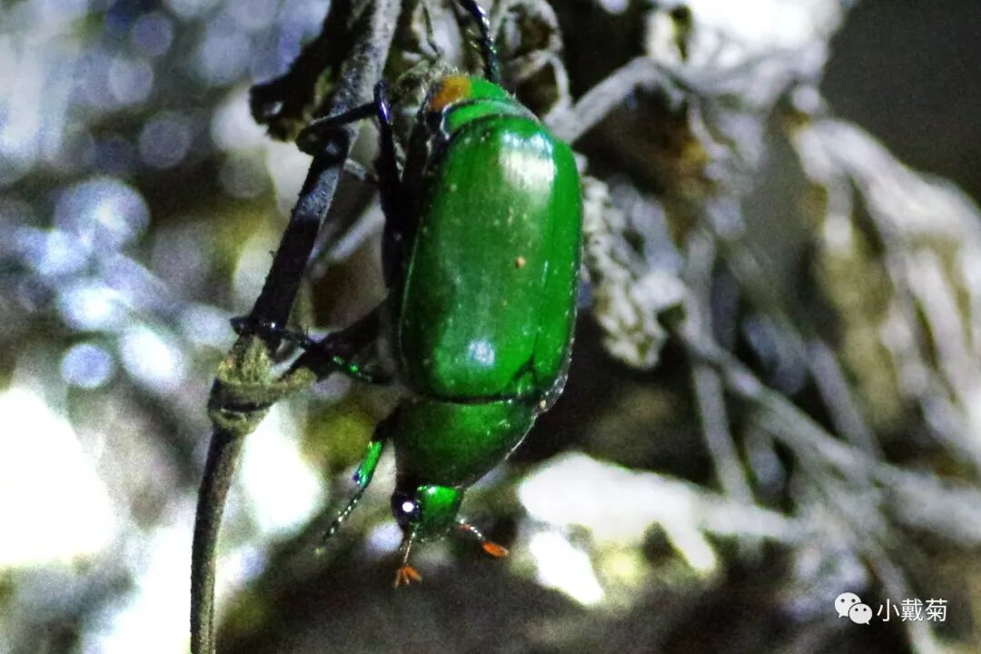 眼尖的军老师还指给我们看溪下石头上面,一只小而闪耀的绿色甲虫,一时也看不清是叩甲还是吉丁。后来查了一下,这是桃金吉丁。