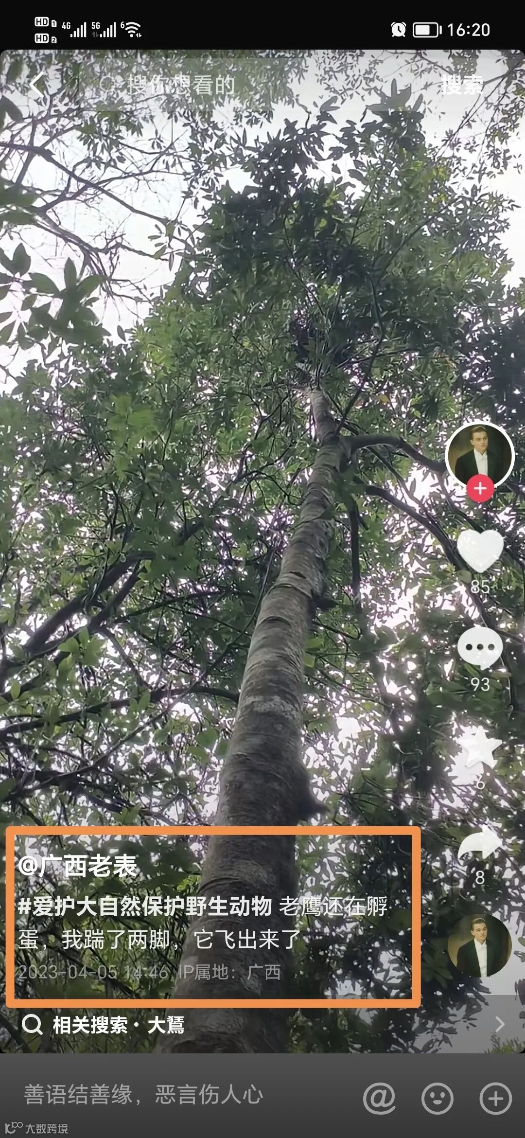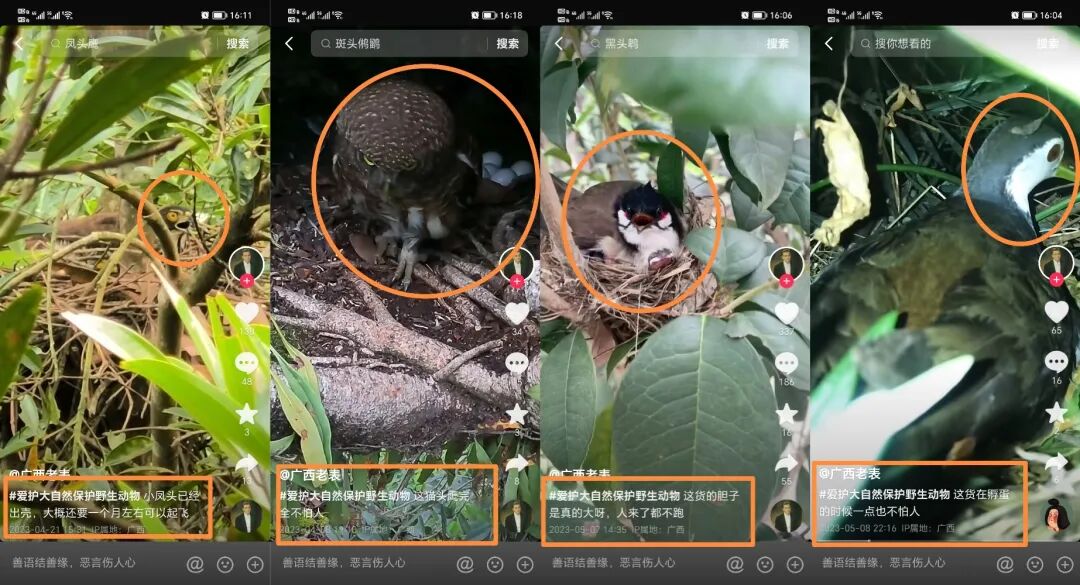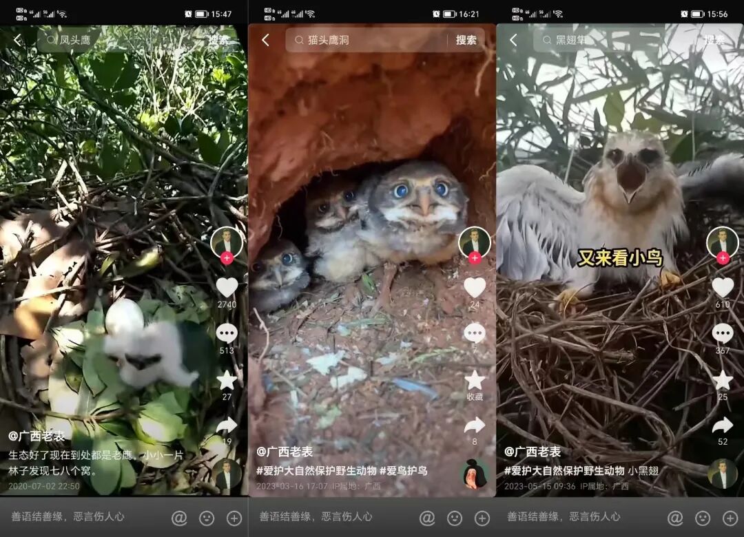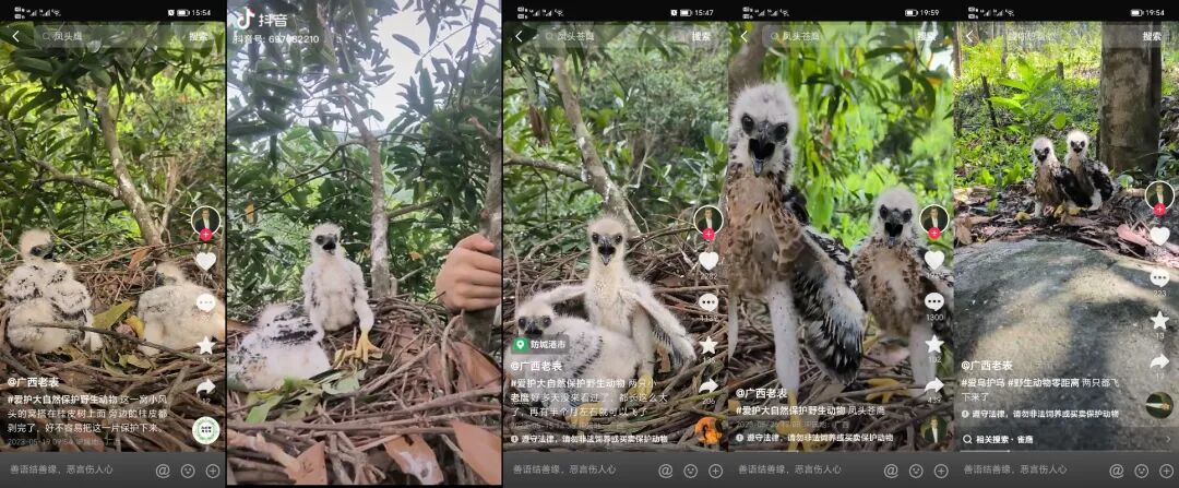一个名为“广西老表”的抖音用户发布了数量众多的近距离拍摄各类野生鸟类孵蛋、育雏的视频,他还特意拍摄了一对鹰宝宝的“成长记录”。每次爬树巢拍,都把两只鹰宝宝吓够呛,又张嘴又尖叫又炸毛又挥翅,但没用。