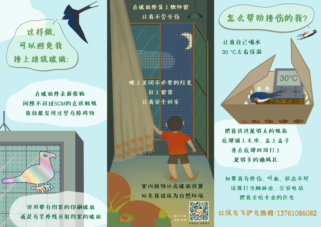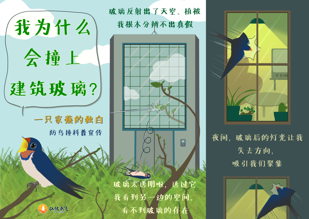 欢迎您点击上方按钮,为一线护鸟团队助力,共同保护野生鸟类和牠们的栖息地。请保存下方防鸟撞折页图,并将它转发、传播给更多人!参照图片所示行动,共同守护野生鸟类,减少人类玻璃建筑对牠们的伤害。
