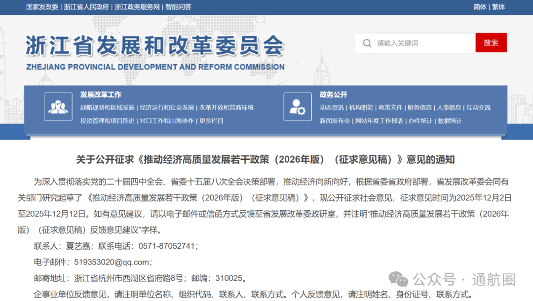 12月2日,浙江省发改委发布通知,公开征求《推动经济高质量发展若干政策(2026年版)(征求意见稿)》意见。征求意见稿提到,推动民航强省建设和低空经济发展。支持A类通用机场建设运营、开通通用航空短途运输航线等,支持打造低空产业“先导区”和低空经济“先飞区”,省级财政给予一定支持。新开无人机航线100条以上。
