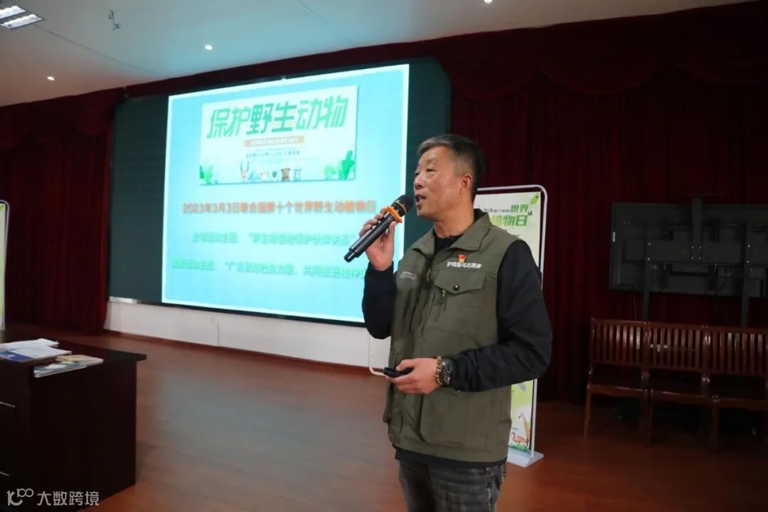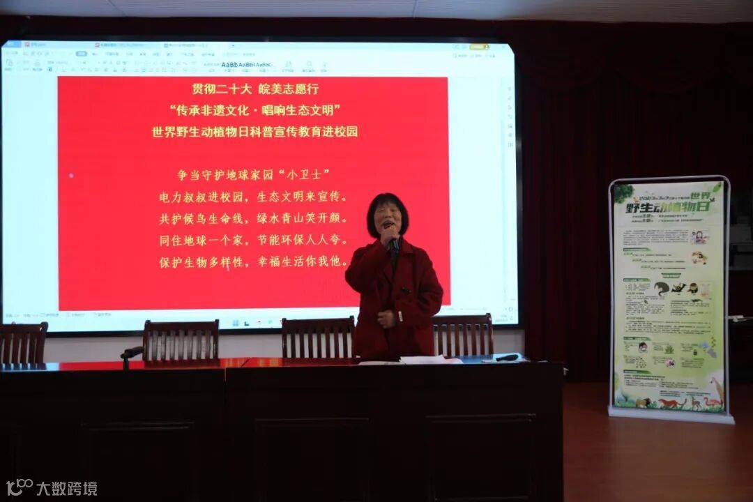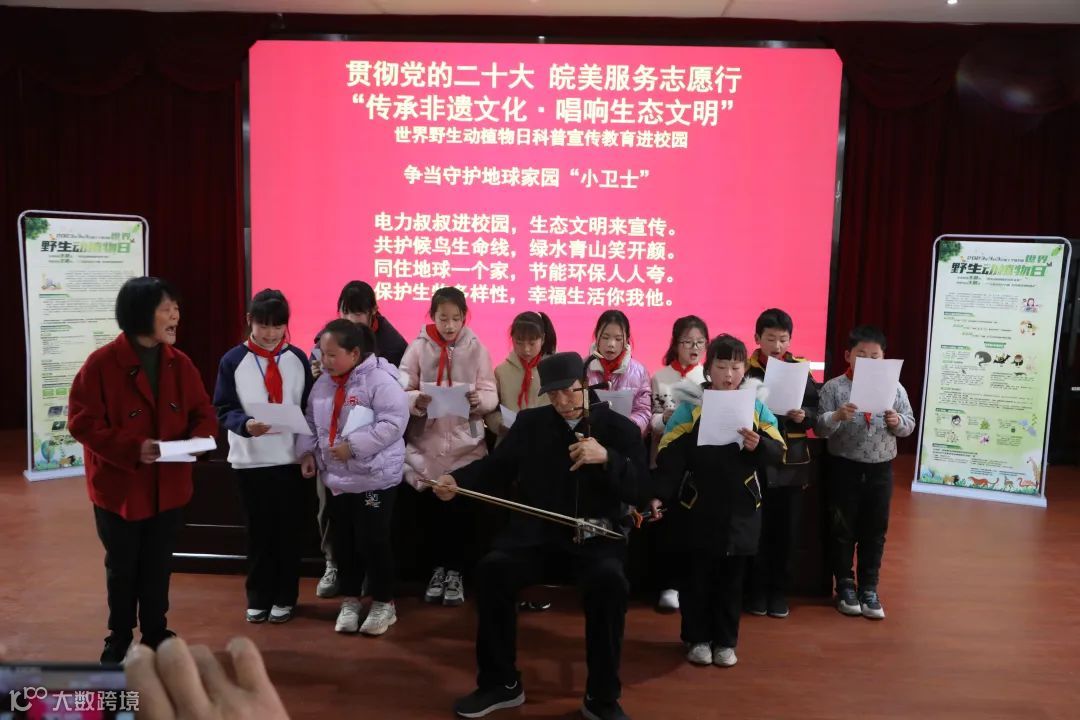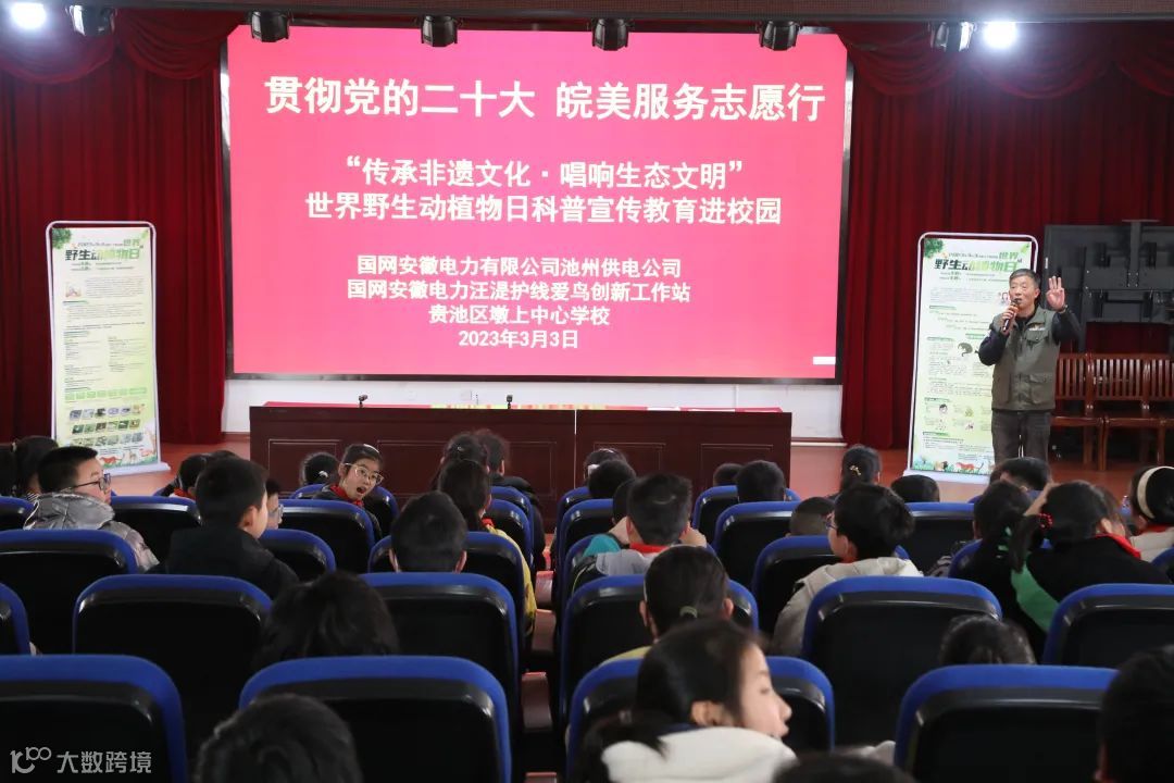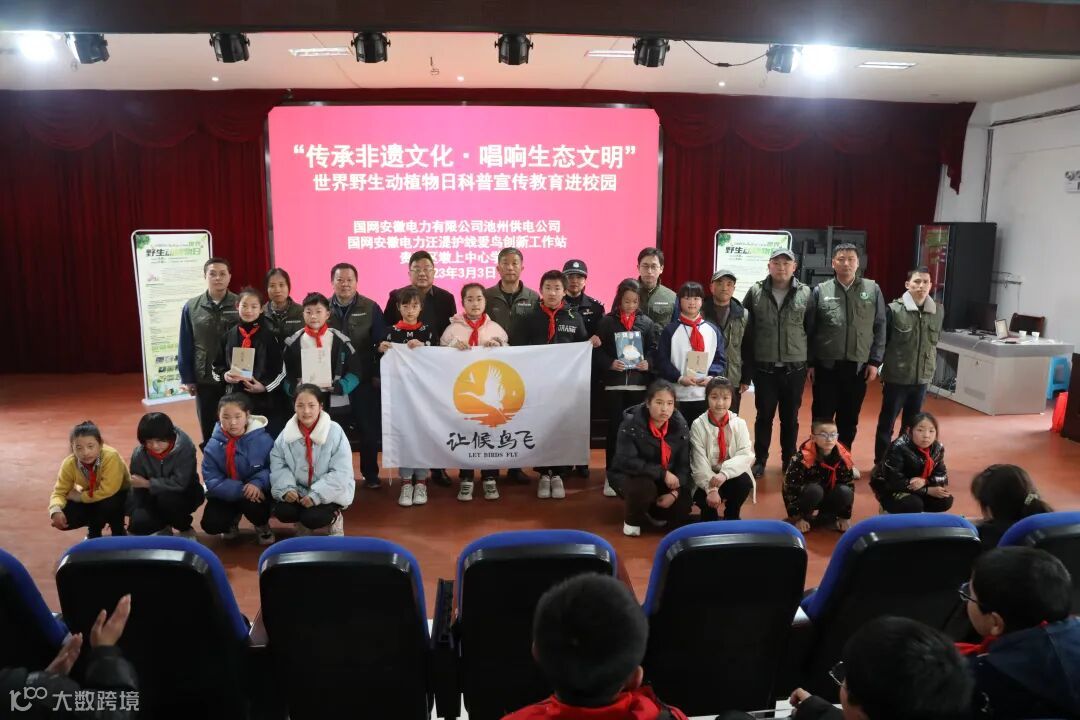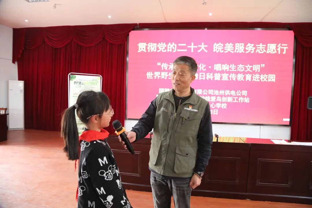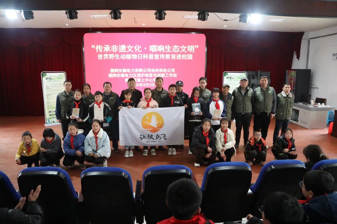 当天下午,国网池州供电公司“皖美”青年志愿者联合让候鸟飞护鸟伙伴国网安徽电力汪湜护线爱鸟创新工作站志愿者来到墩上中心学校,举办“传承非遗文化·唱响生态文明”主题实践课堂,通过以案说法、现场讲述、互动交流、折页展示等方式,向同学们普及野生动植物保护知识及护线爱鸟相关常识等,培养孩子们热爱自然与生命的意识,向青少年传播保护生物多样性的意义,引导他们积极主动参与到野生动植物资源的保护、宣传和实践中来,争当守护地球家园的“小卫士”。