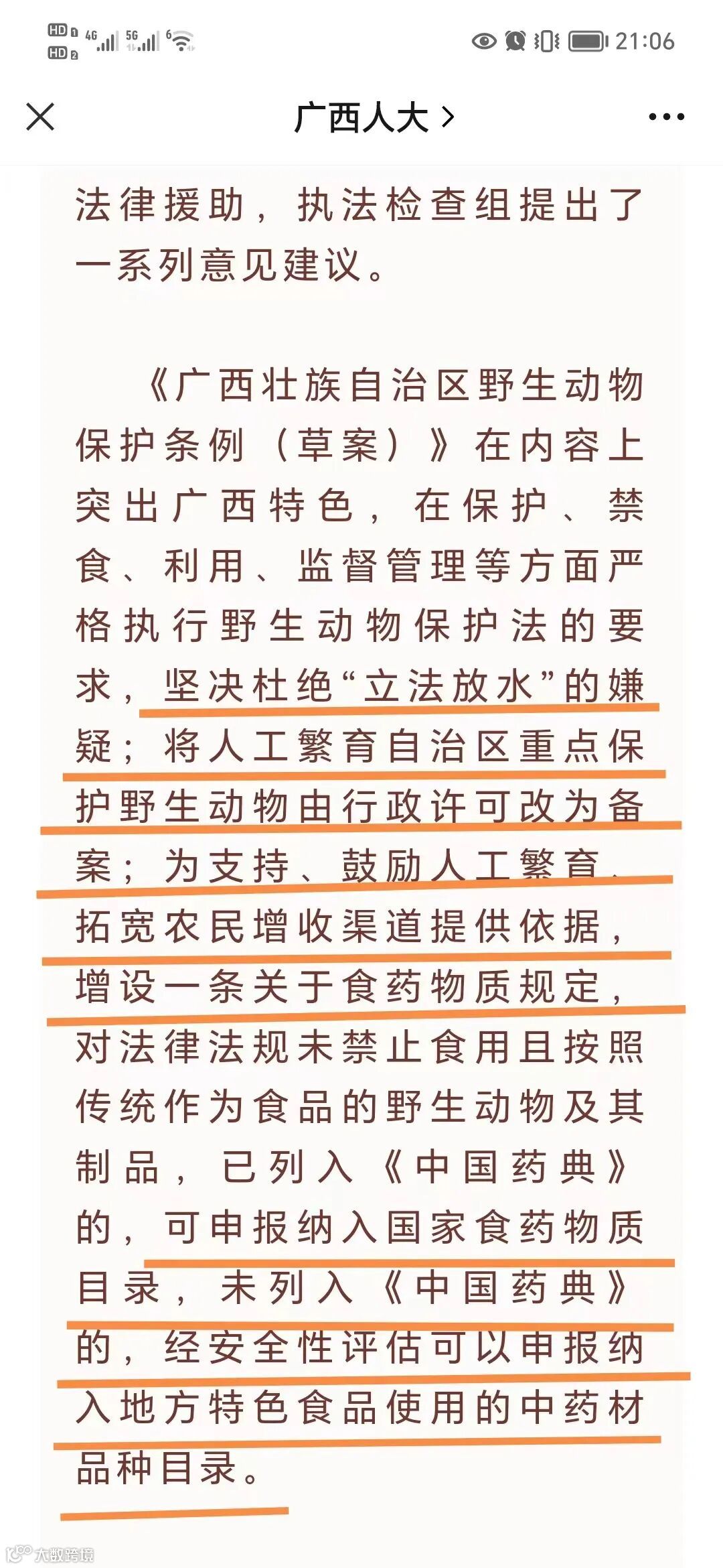 3,第二十二条也是参考了《野生动物保护法》相关规定,规定可将广西本地“人工繁育技术成熟、种群稳定的自治区重点保护野生动物”纳入“自治区重点保护野生动物人工繁育技术成熟物种名录”,简化审批流程,方便商业利用。早在2018年,广西就发布过《广西壮族自治区人工繁育技术成熟陆生野生动物名录》(第一批),包括滑鼠蛇、眼镜蛇、中华竹鼠、银星竹鼠、果子狸、豪猪、野猪、环颈雉,不清楚该名录是不是继续有效。