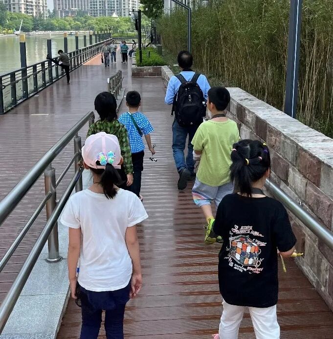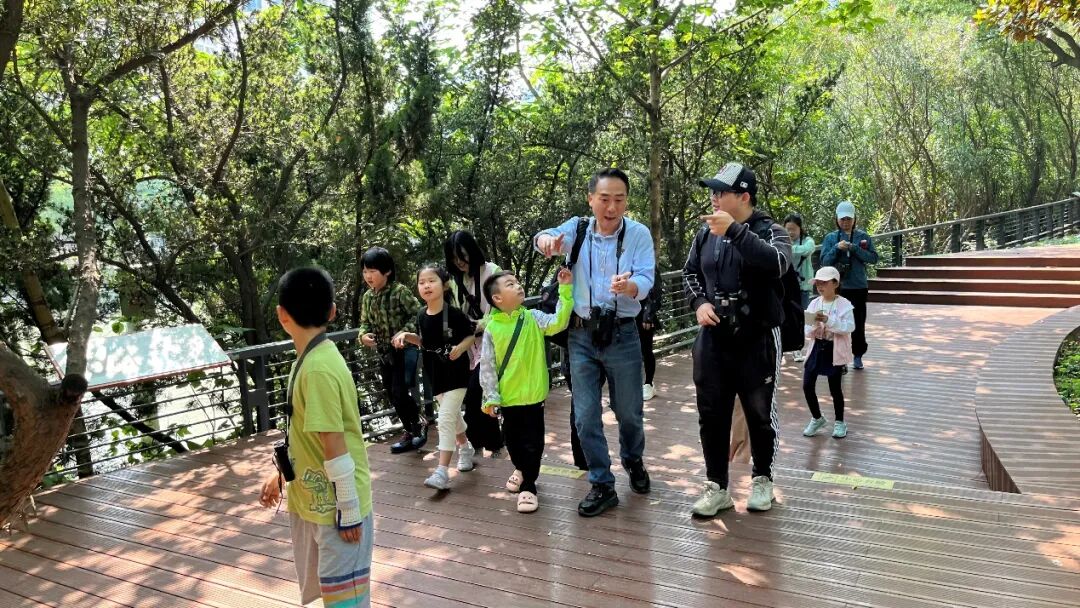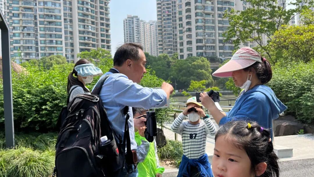 观鸟路上,孩子王军老师一边带队,一边耐心解答大小朋友们天马行空的各种问题。