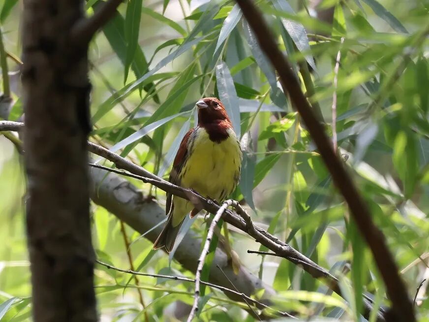 突然一个鸟影飞过,军老师光速识别出来:栗鹀。栗鹀为鹀科鹀属的鸟类,体重15-22克,体长130-148毫米。体型略小,是一种栗色和黄色的鹀。