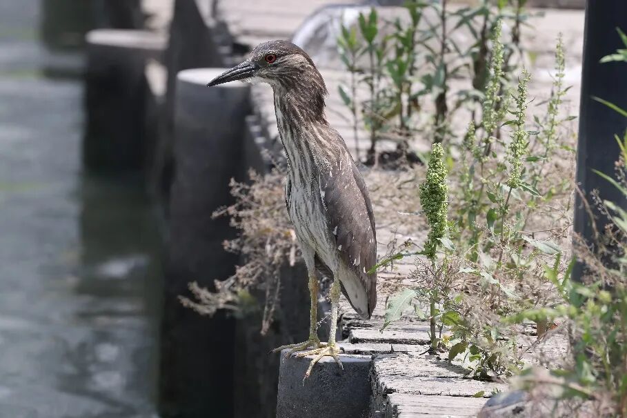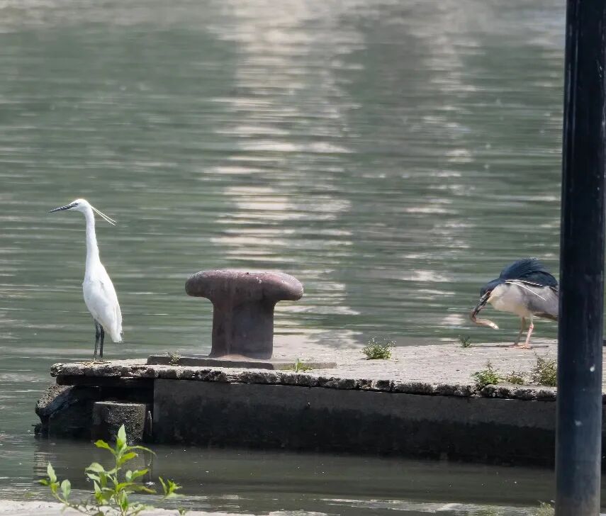 我们慢慢走到了河边,此时的夜鹭似乎正在琢磨着今天的早午餐,来条泥鳅想必也是极好的。而旁边的白鹭则不为所动,继续密切监视鱼群动向。