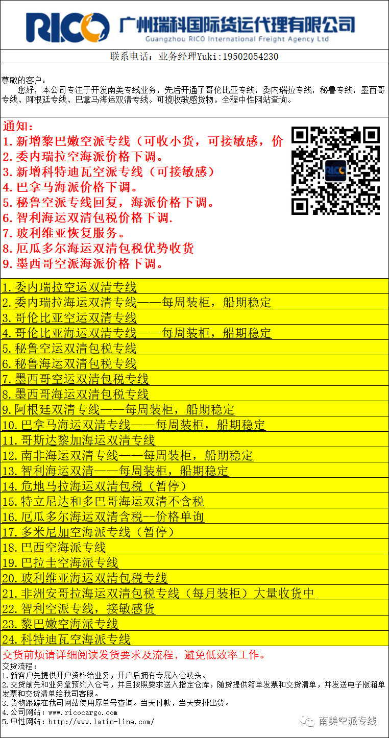 广州瑞科将全力打造拉丁美洲的全航线一条龙服务,为降低拉丁美洲的运费而不懈努力,希望能得到各位同行客户朋友的支持,如有兴趣,可以联系我司Yuki 19502054230,洽谈合作,共同发展。谢谢大家。