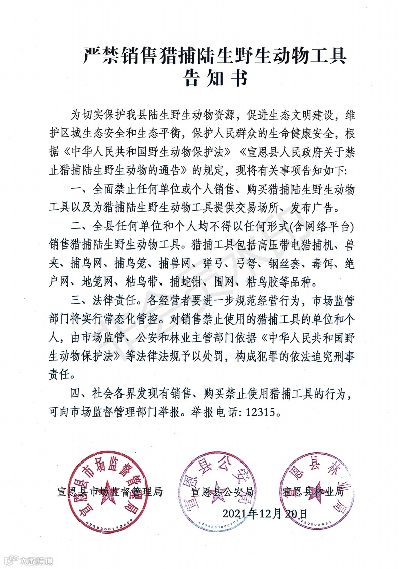 8,2021年12月20日湖北恩施宣恩县发布《 严禁销售猎捕陆生野生动物工具告知书》,全面禁止任何单位、个人销售、购买猎捕陆生野生动物工具以及为猎捕陆生野生动物工具提供交易场所、发布广告。全县任何单位和个人均不得以任何形式(含网络平台)销售猎捕陆生野生动物工具。猎捕工具包括高压带电猎捕机、兽夹、捕鸟网、捕鸟笼、捕兽网、弹弓、弓弩、钢丝套、毒饵、绝户网、地笼网、粘鸟带、捕蛇钳、围网、粘鸟胶等品种。对销售禁止使用的猎捕工具的单位和个人,由市场监管、公安主管部门依据《中华人民共和国野生动物保护法》等法律法规予以处罚,构成犯罪的依法追究刑事责任。