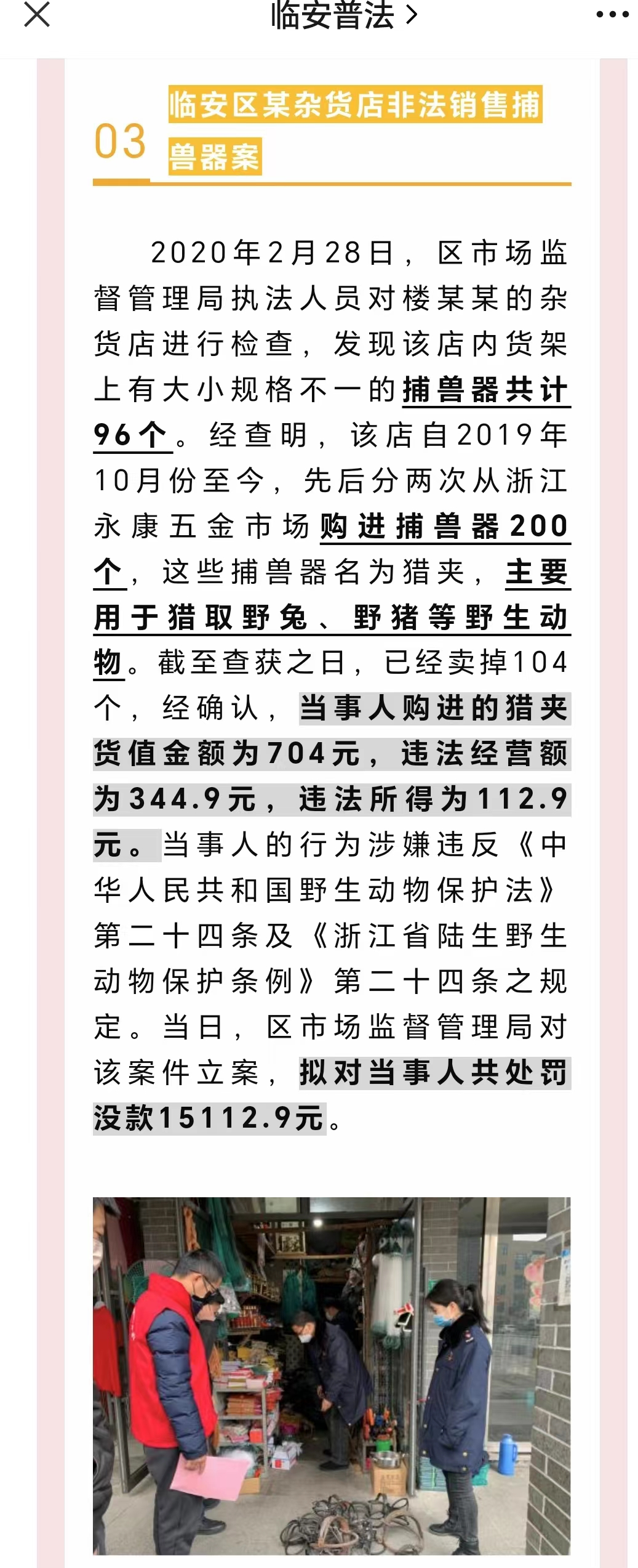 9,2020年2月12日,黄山市黄山区市场监管局发布《关于加强全区野生动物狩猎工具生产销售管理工作的通知》。规定1,生产、销售排铳、铁夹、吊杠、电捕、地枪(地弓)及其他危害人畜安全的猎捕工具和装置必须符合《中华人民共和国产品质量法》的规定;2,禁止生产、销售电捕等危害人畜安全的猎捕工具和装置。各市场监管所要加强对本辖区销售野生动物和狩猎工具的专项整治工作,通过上门检查、张贴标语等形式广泛宣传野生动物疫情防控工作的意义。严禁非法生产、销售狩猎工具,对发现有野生动物交易和非法生产、出售禁止猎捕工具的要从严从快从重查处。