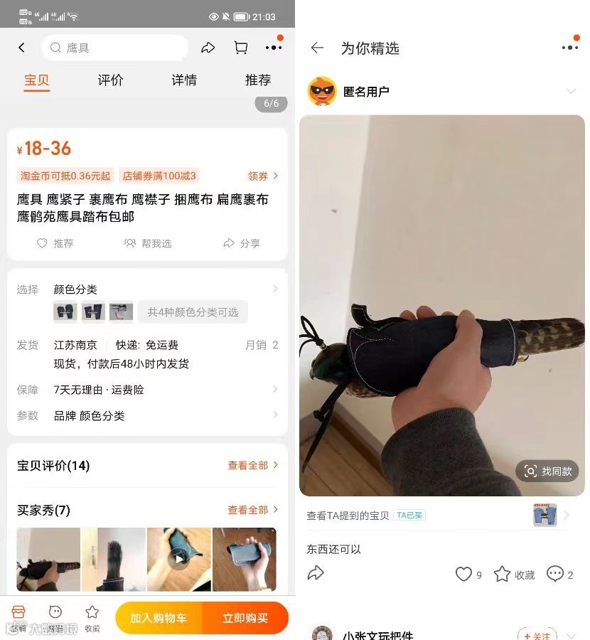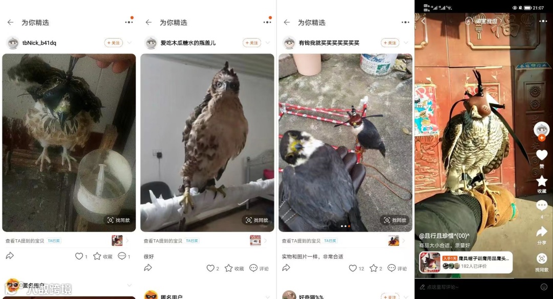 调查发现一个名为“中华鹰鹘苑”的淘宝商家主要出售鹰帽、脚绊、鹰架、隼台、裹鹰布等各类鹰具,这些鹰具主要被用于训练猛禽。在一些商品的“买家秀”板块出现了大量猛禽,个别买家称自己是“救助”,但多数对于猛禽来源没有任何说明。