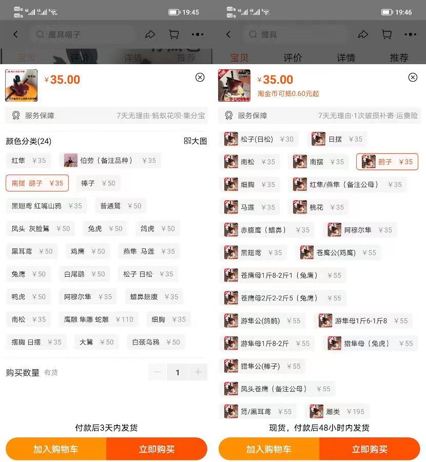 从上图还可以看到商家服务也很到位,买家可以根据不同种类的猛禽和体型大小选择对应商品。