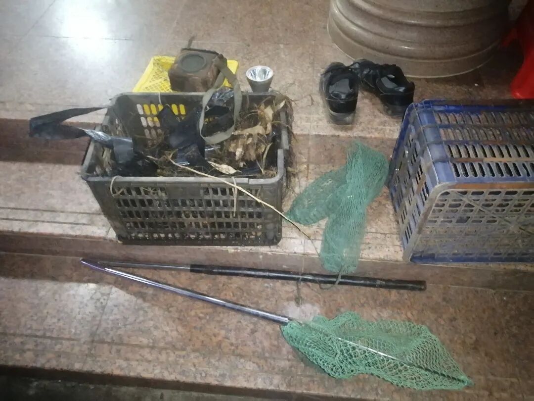 志愿者巡护至广东湛江市雷州企水镇,在北联村附近树林水塘边发现一处盗猎点,随后夜巡广东省湛江市遂溪县乐民镇,在深田村附近,发现有3人盗猎。志愿者随即进行举报,随后民警来到现场,控制犯罪嫌疑人1名,现场收缴多个盗猎工具。目前警方已立案调查。