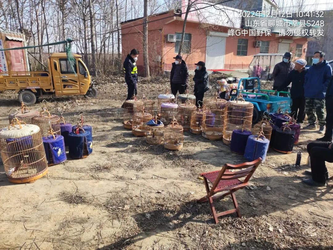 志愿者在山东聊城萃县一鸟市场贩卖野生鸟,举报后与公安和地方林业执法共同查获违法贩卖画眉,蒙古百灵、云雀共60余只,将九个犯罪嫌疑人由公安部门处理。