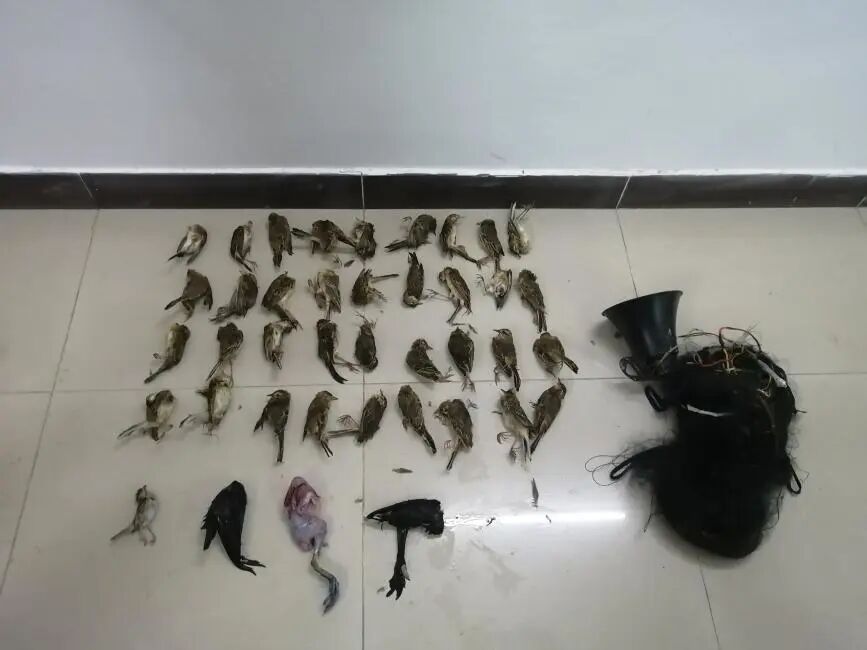 (现场查获的鸟类死体及盗猎工具)