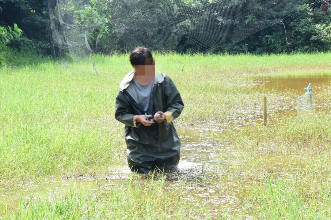 (志愿者进入水塘,将网上的矶鹬救下后放飞)