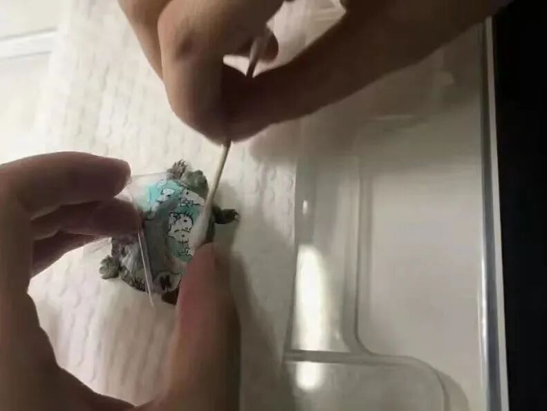 照片中志愿者正在小心翼翼帮小乌龟卸下沉重的油漆壳