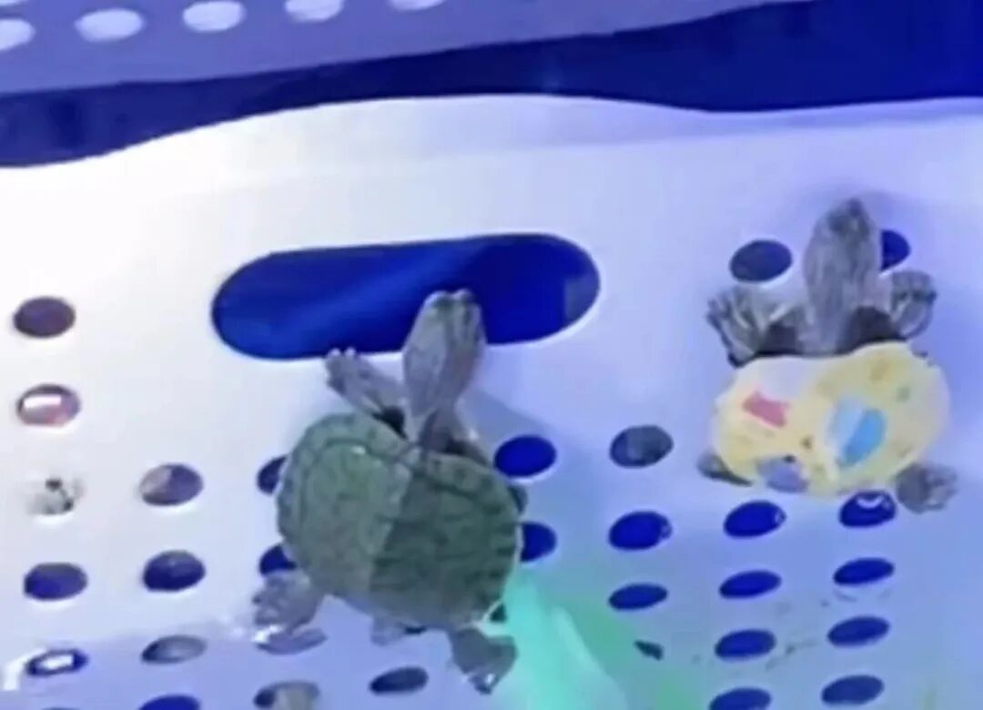 乌龟需要露出水面呼吸,但是游艺乌龟们常常是来不及喘息就又会被网强行扒拉回水里,或者根本找不到可以喘息休息的地方