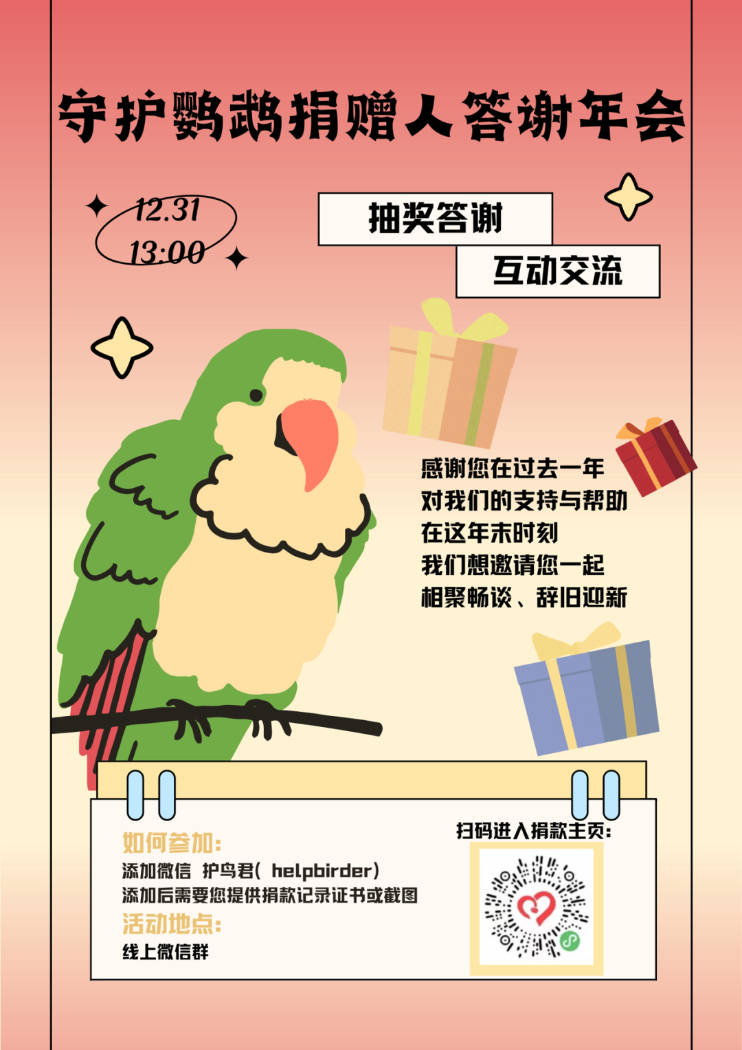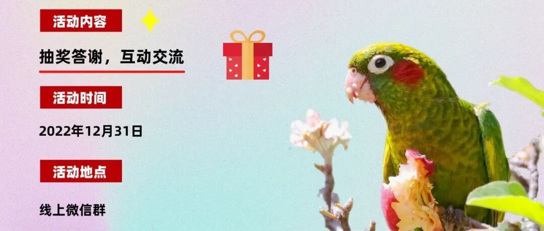 守护鹦鹉的2022有您的参与!现在,我们想邀请所有曾经在2022年支持过守护鹦鹉的捐赠人,给我们一个机会认识您,在这年末时刻和“家人们”相聚聊聊天,一起辞旧迎新。让爱心温暖寒冬!