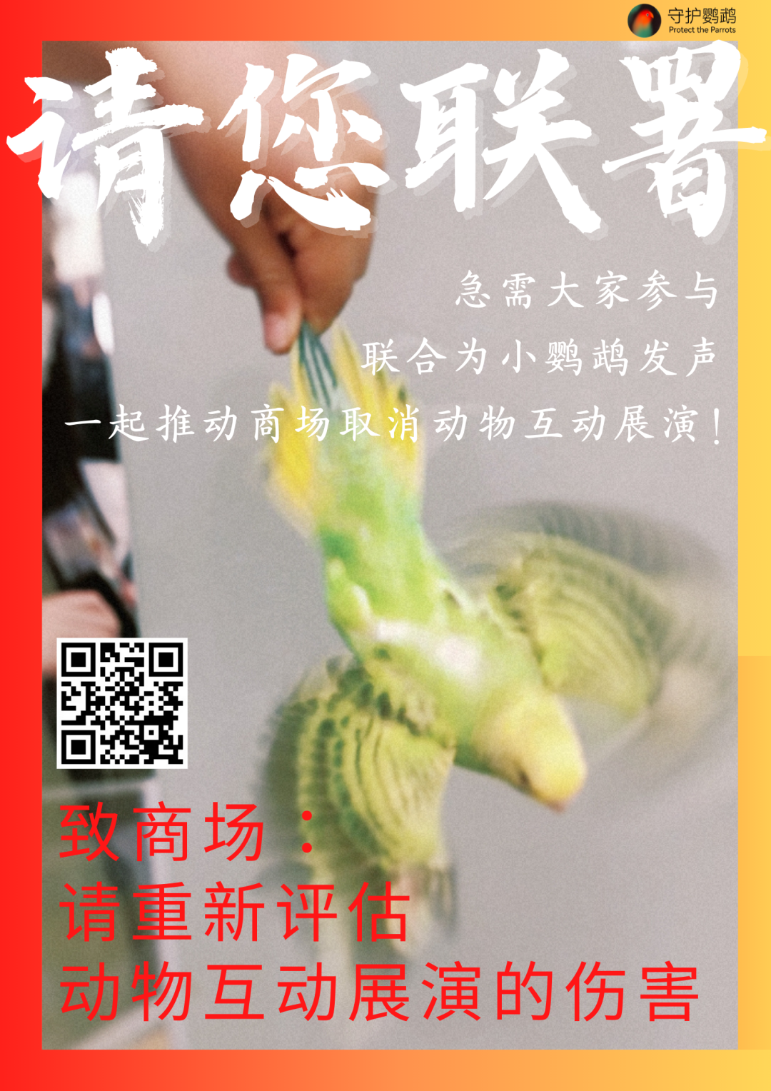 现在,我们正在发起“拒绝活体游艺”春节倡导活动,向更多人科普游艺动物的伤害,呼吁大家主动选择无活体的游艺项目。也欢迎您加入我们,一起共创没有阴霾的“阳光游艺”新风向!联系方式:微信parrothelper