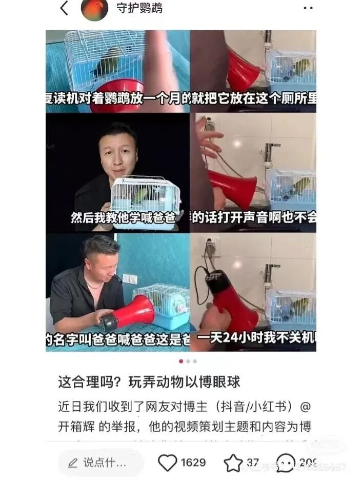 6月18日,我们曝光了小红书一博主以虐待动物的方式博取眼球,如24小时不间断用喇叭对鹦鹉循环播放;将鱼和龙虾同时放进真空袋比谁先死;将雏鸡绑在气球放飞等。