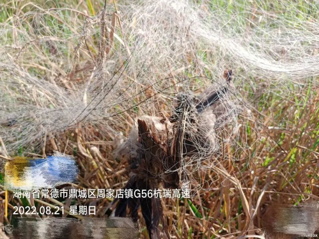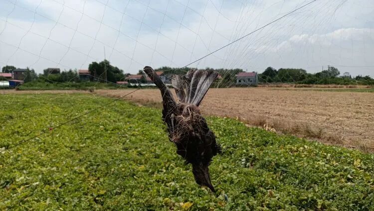 随后,在鼎城区石公桥镇三兴村村部后四百米处一己收成的西瓜地里,志愿者发现第二处捕鸟网,一共两张,网上有包括斑鸠等鸟类死体两只。两处鸟网均被当场拆除,死去的鸟儿也已无害化处理。