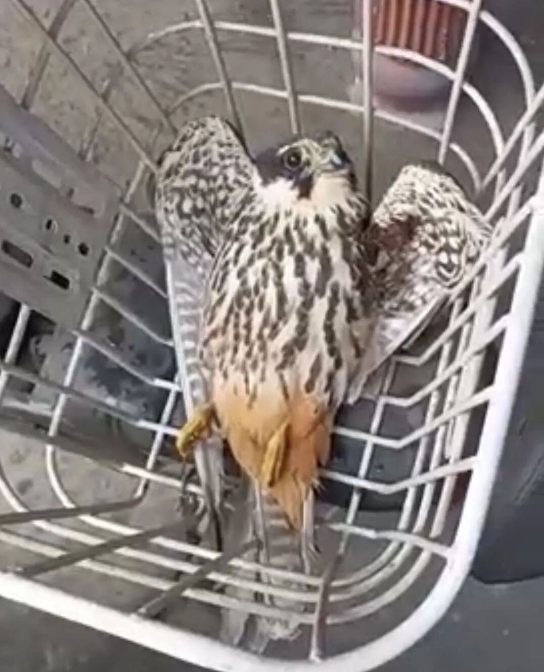 当天,志愿者接到110平台的求助,医科大学内发现成年游隼1只。该游隼目前已经移交保护中心进行救助治疗。