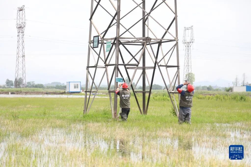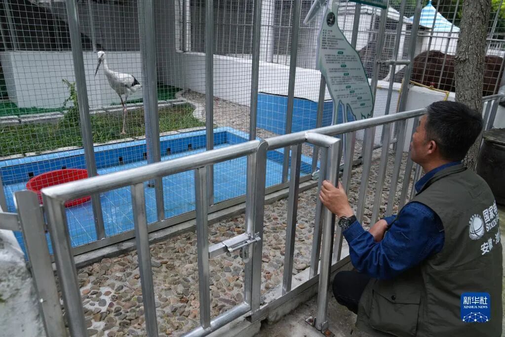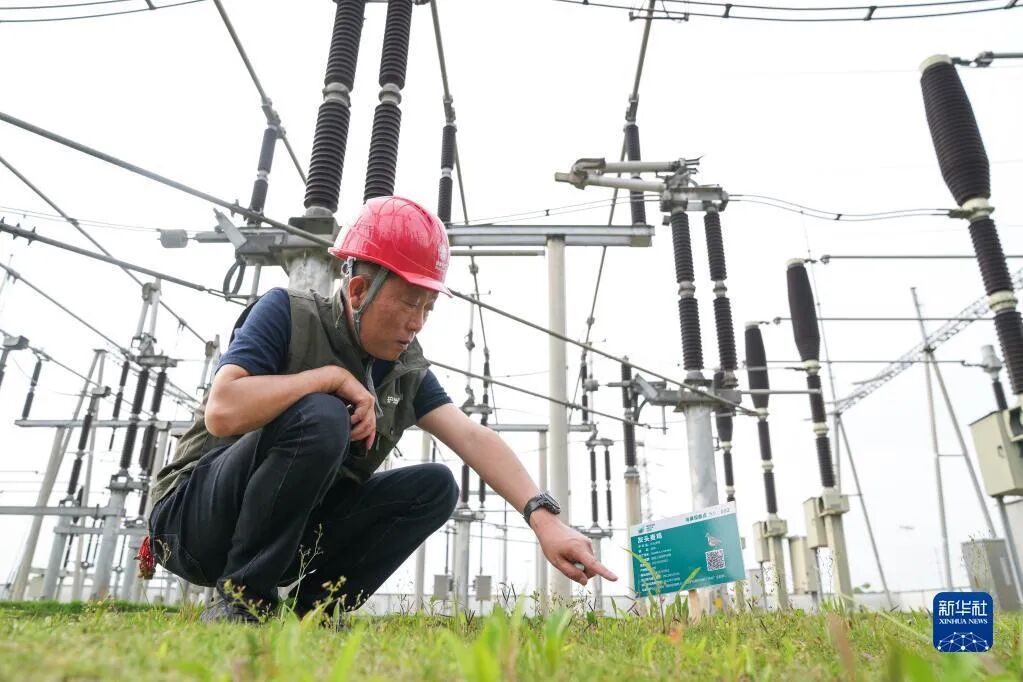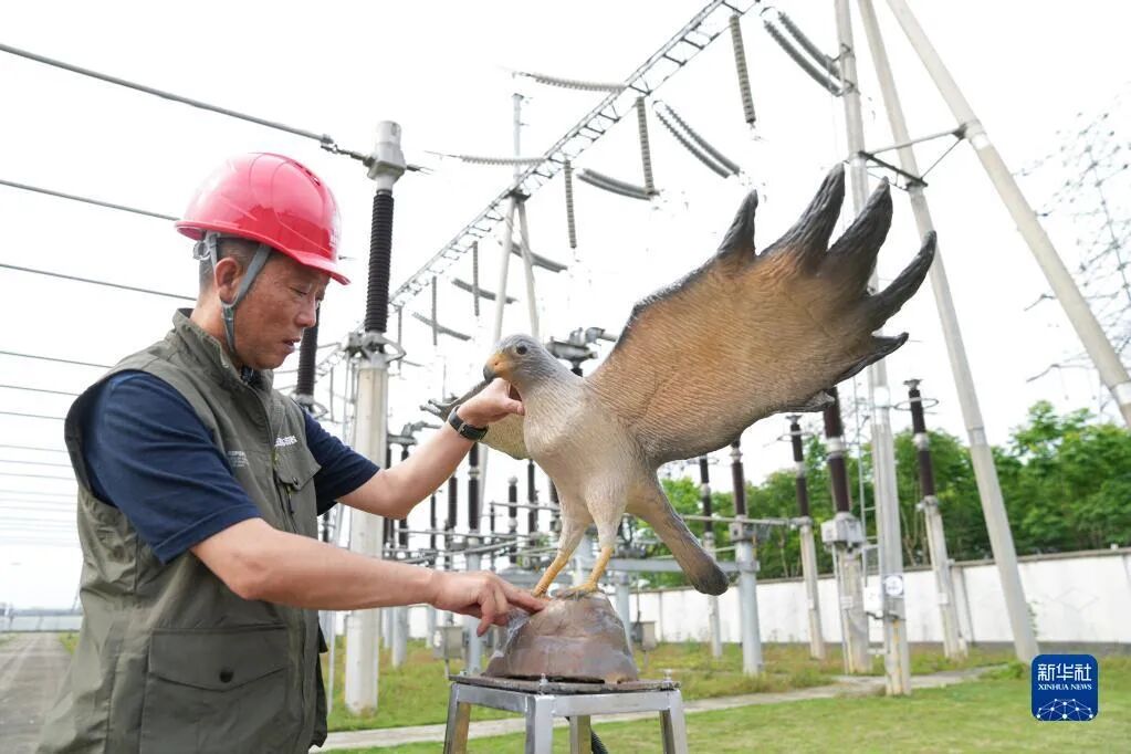 5月18日,在安徽省池州市220千伏枫岭变电站内,志愿者汪湜调试仿真鹰驱鸟装置。新华社记者 杜宇 摄