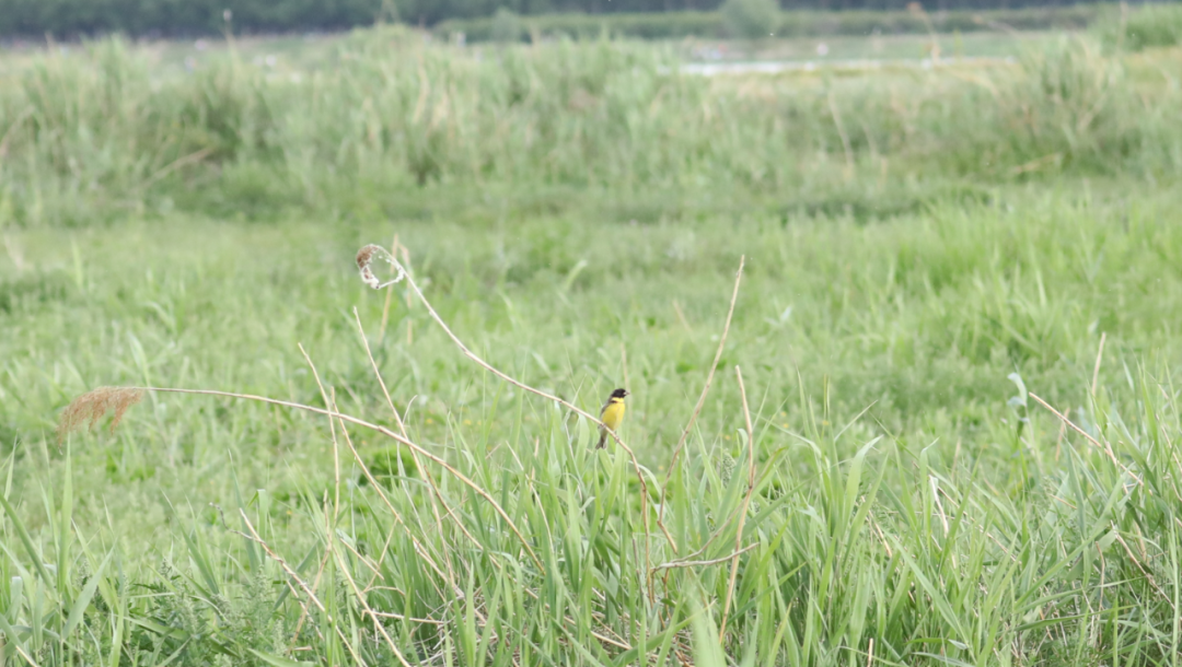 原图中,可见黄胸鹀周围的生境特色,北岸草滩上大面积连续的芦苇丛,提供了极好的生存庇护。摄影:麒麟,2022年5月15日于北京沙河