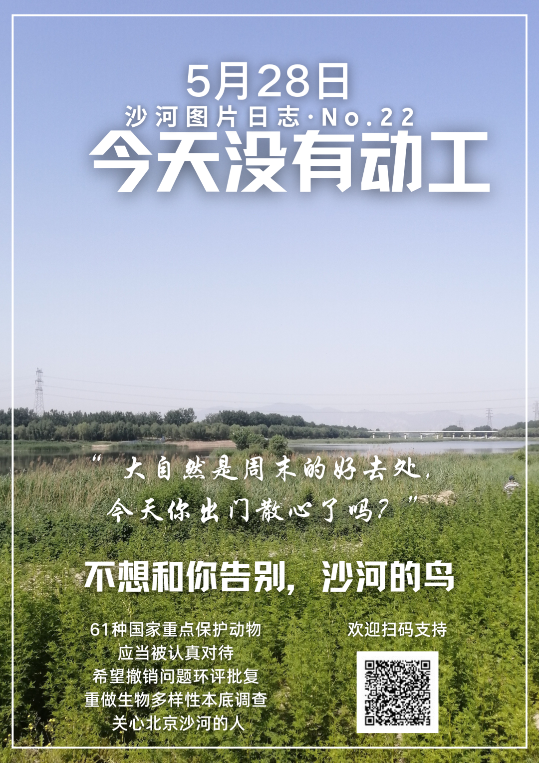自4月29日的这一轮呼吁至今,在许多人的努力呼吁和积极投诉下,沙河湿地关键区域之一的北岸滩涂,工程围栏搭建没有进展,也没有工程机械进入。沙河志愿者们每日前往湿地查看监测动态,并发布图片日志留存。