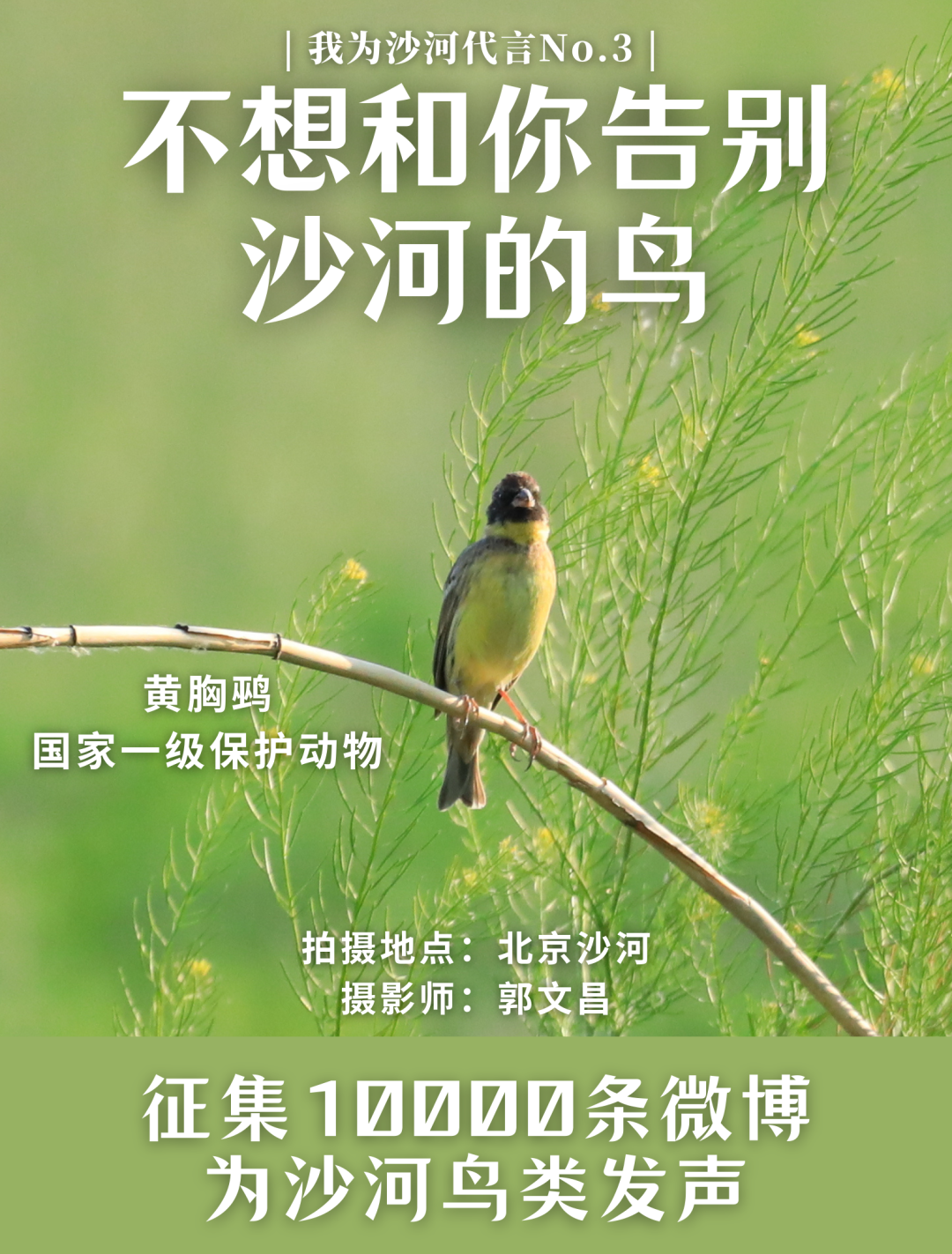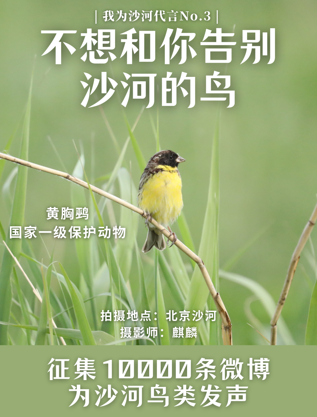 今天我们要介绍的是摄影师麒麟和郭文昌,5月在沙河拍到的国家一级保护动物黄胸鹀!