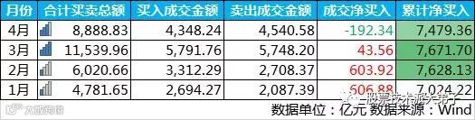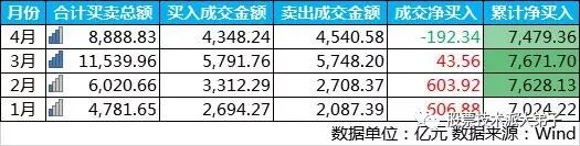此外,随着年初以来股指的回暖,北上资金成交额也出现逐渐放大趋势。数据显示,1月份,沪深股通合计成交金额为4781.65亿元,2月份和3月份,沪深股通成交金额持续放大,3月份达到近年来成交额的顶峰,即1.15万亿元,4月股票交易时间还未结束,但从截至目前的数据来看,沪深股通4月份成交金额依然维持在高位。