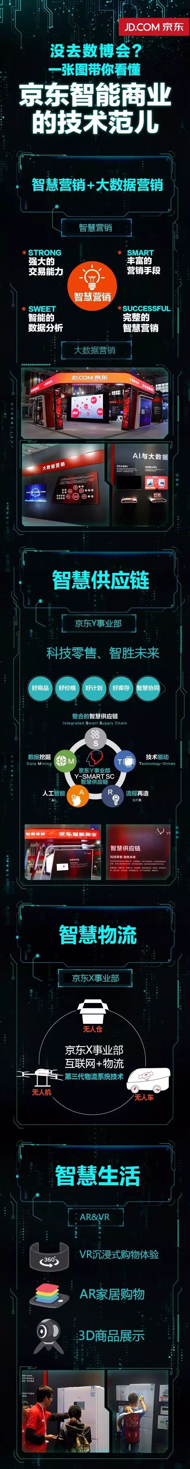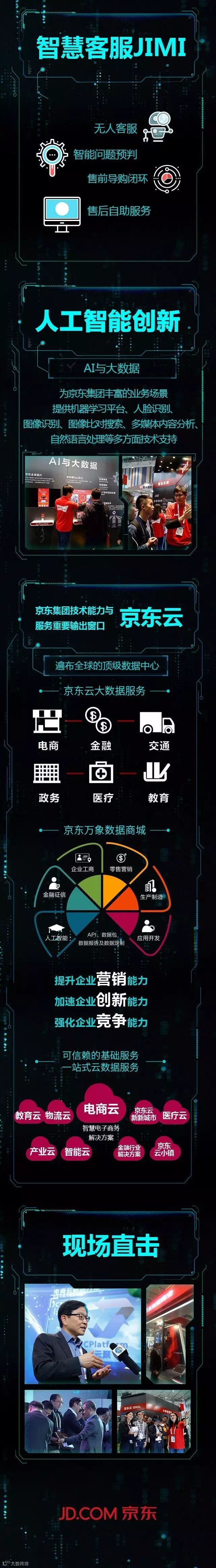 京东展位汇集智慧营销、大数据营销、智慧供应链、智慧物流、智慧客服JIMI、VR&AR、京东云等科技感十足的多个板块,集体亮相数博会,充分展示了智能化商业在京东丰富的应用场景,全面描绘了京东智能商业的未来布局。