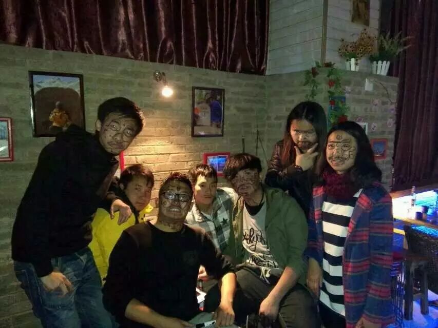 当酒吧老板和客人一起做游戏的杨智红(右3)