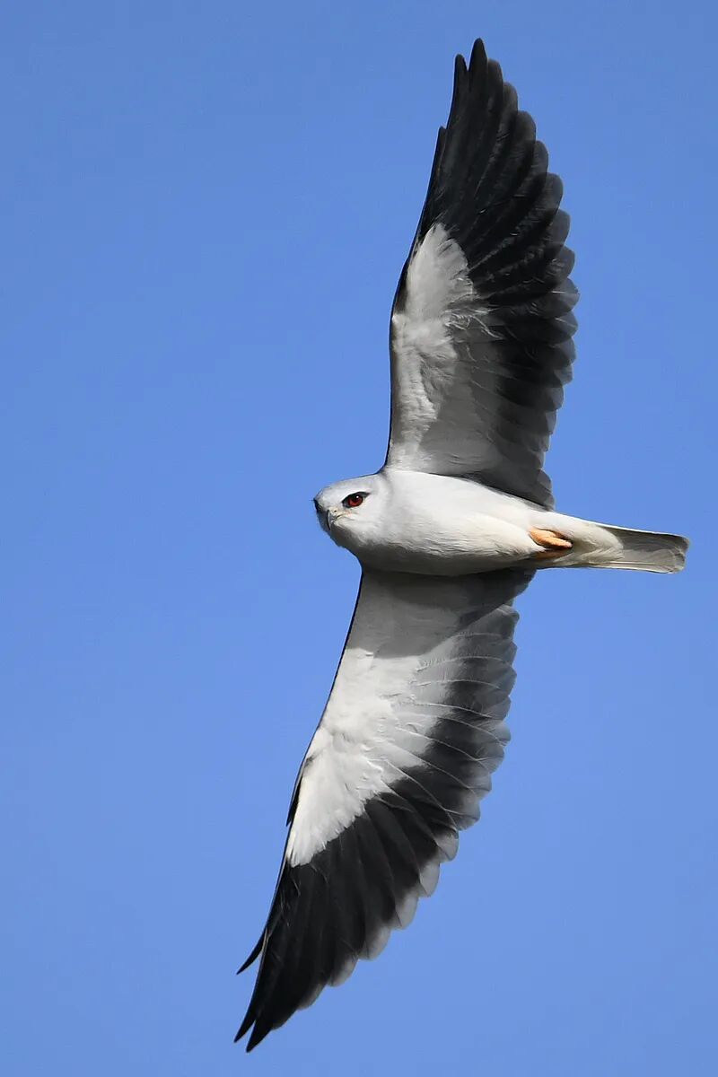 黑翅鸢是一类中型猛禽,外表很酷,具有高超的飞行和滑翔能力,振翅空中悬停的绝技更是鹰科中独一无二。特征是有黑白分明的羽毛,明亮的红眼睛,爪部黄色。主要以田间的鼠类、小鸟、小野兔、昆虫和爬行动物等为食。白天常见停息在大树树梢或电线杆上,当有小鸟和昆虫飞过时,才突然猛冲过去扑食。飞翔的高度较低,采用盘旋、翱翔等方式,有时也进行鼓翼飞翔。在鼓翅旋停时两翅煽动较轻,显得相当轻盈,发现地面上的猎物时突然直扑而下。一般单独活动,多在白天的早晨和黄昏进行(摘自百度百科)。
