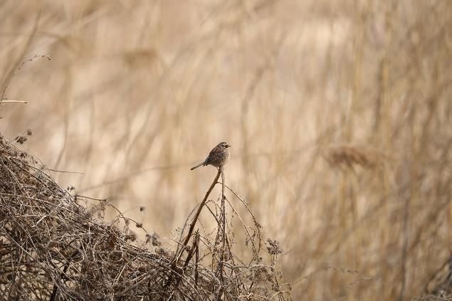 棕眉山岩鹨在芦苇丛休憩,芦苇大量铲除,