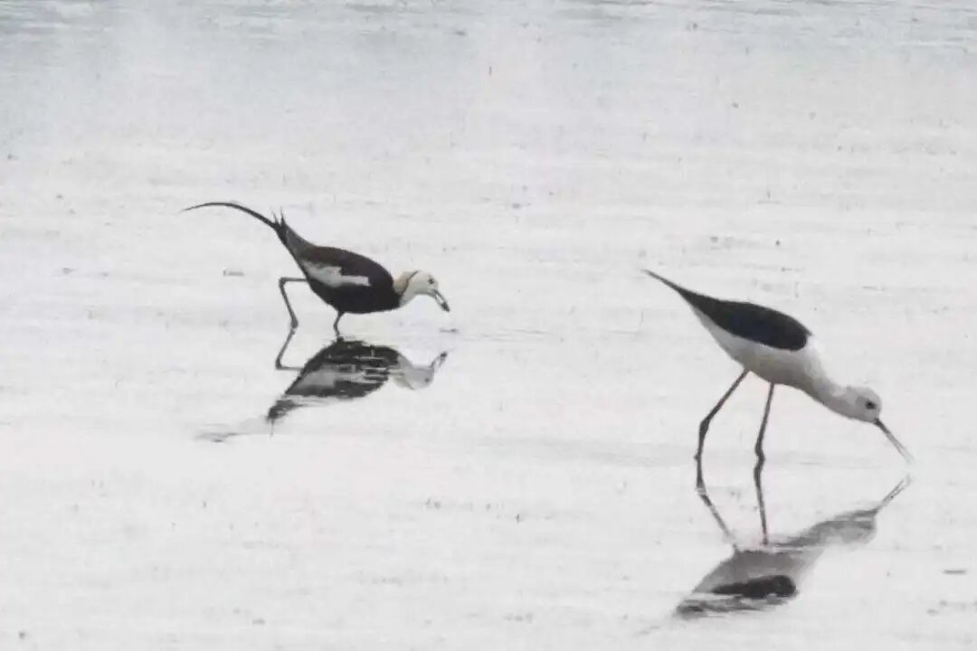 水雉和黑翅长脚鹬正在浅滩觅食,清淤后这些浅滩将消失,它们也将失去食物来源。