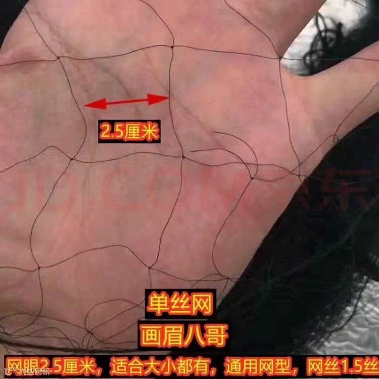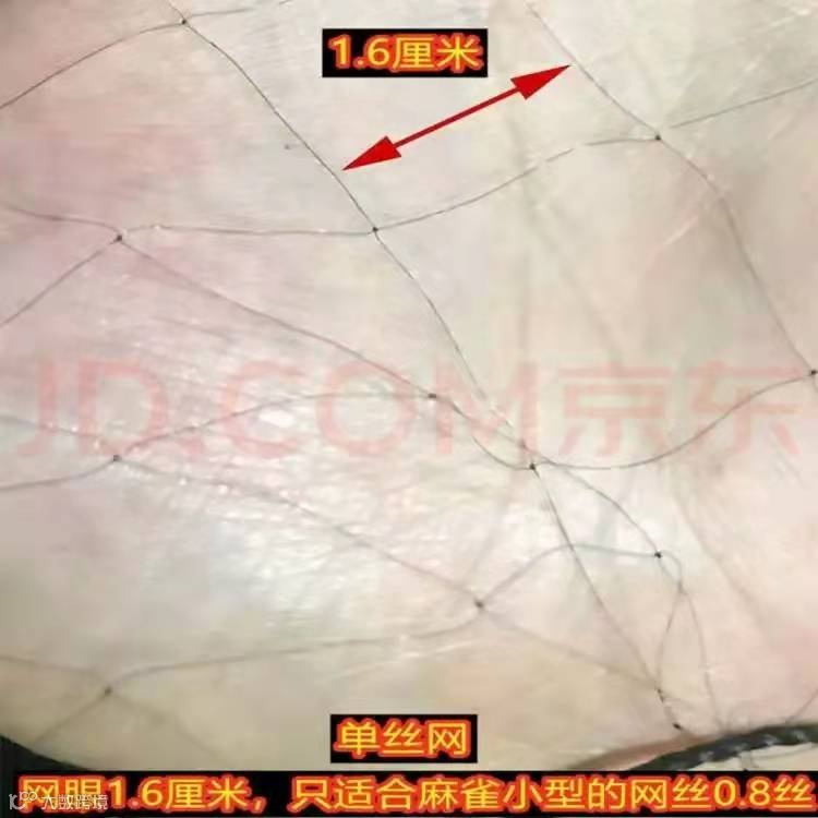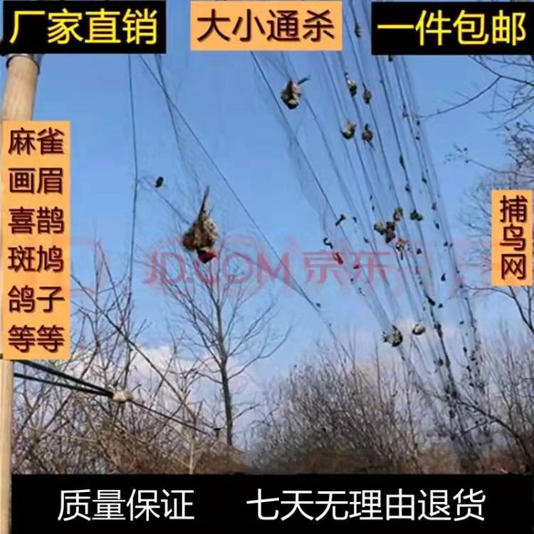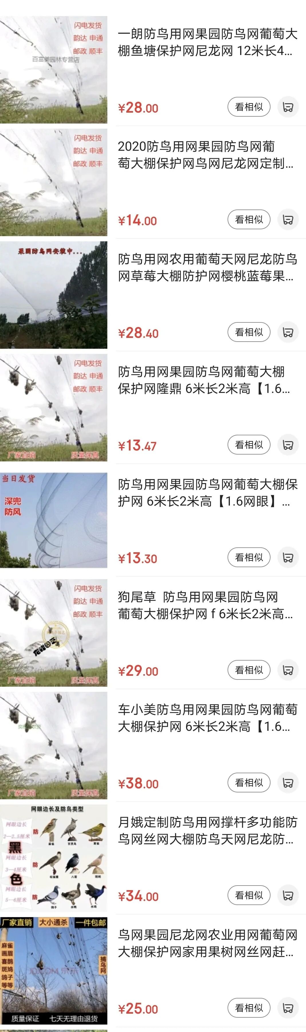 捕鸟网:商品图片明确展示着挂网鸟类,同时注明“深兜”、“防风”、“大小通杀”等字样,还详细说明不同规格不同材质的鸟网是针对哪些体型的鸟类的。