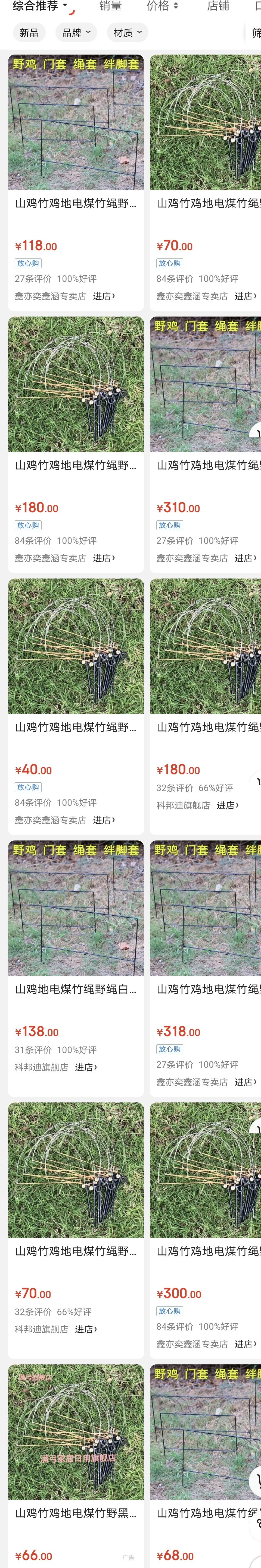 猎套:专门针对山鸡竹鸡等经常在地面活动的鸟类,明目张胆。就问你京东管不管,而商家似乎并不怕被平台处理、下架,大不了我过两天再来。