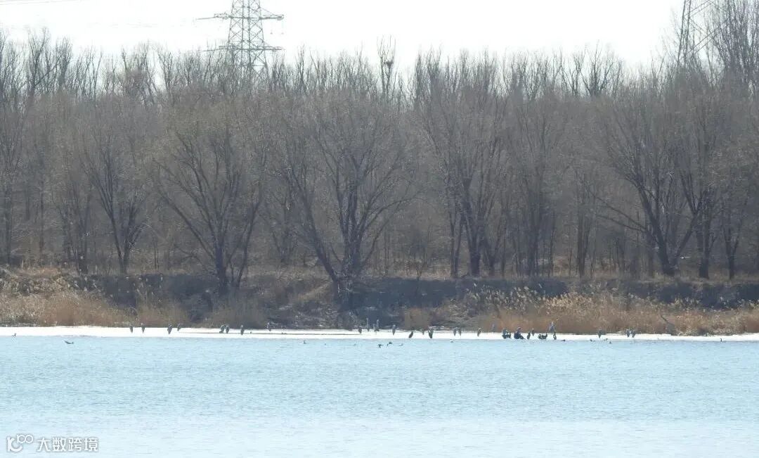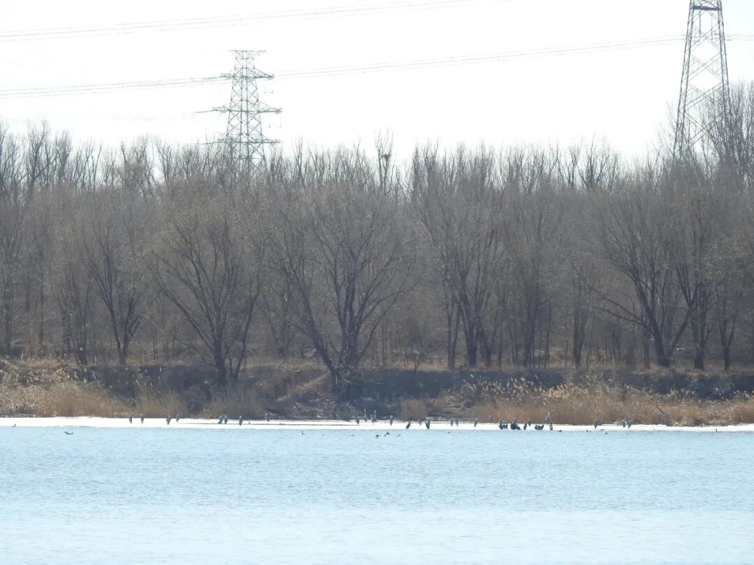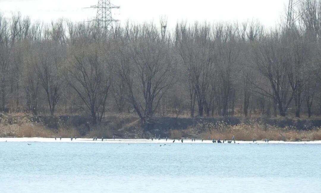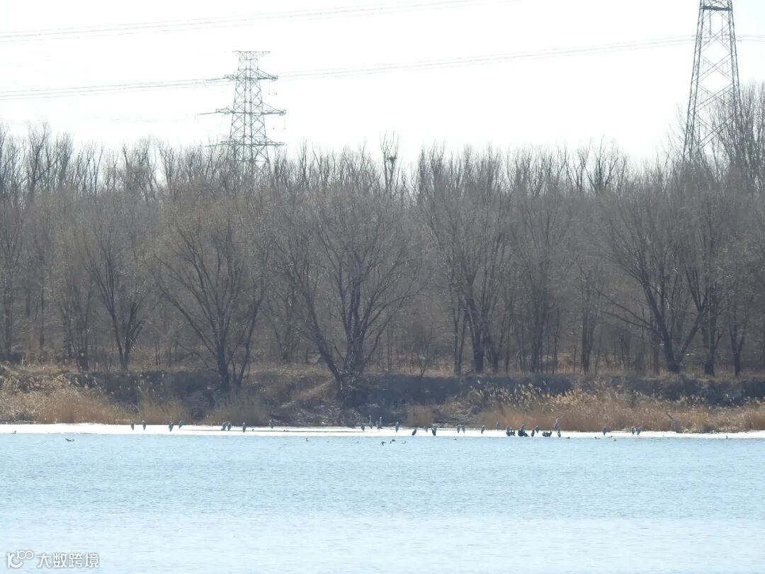 普通鸬鹚密密麻麻聚集在窄冰边缘,其中混入了几只西伯利亚银鸥和苍鹭,突然听到一阵急促且声势浩大的振翅声,近五百余只普通鸬鹚或因惊扰而分两批先后易地,落在浮冰的不远处。让我们不由得感叹这虽不及海滨群鸟起飞的壮阔、但在北京近郊的湿地看到这样的盛况也实属难得。