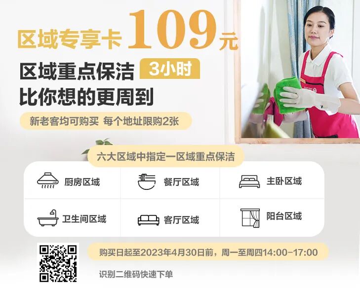 【区域保洁】109元3小时厨房/餐厅/主卧/卫生间/客厅/阳台六大区域中指定一区域重点保洁