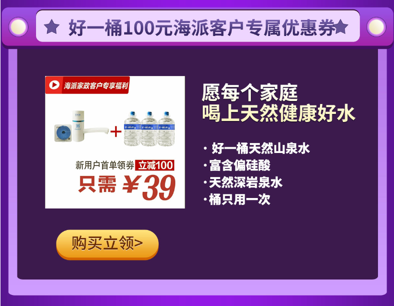2、适用范围:优惠券仅用于购买好一桶山泉指定超值套餐
